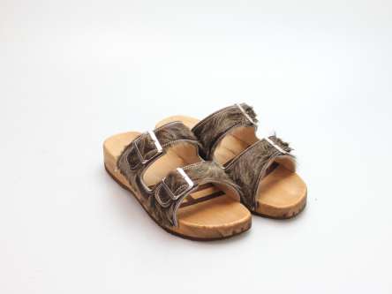 Holzsohle mit eingearbeitetem Fußbett. Die Laufsohle ist aus rutschfestem und abriebfestem PU. Durch die bewegliche Holzsohle ist die Sandale weich und leise beim Auftreten. Mittels zwei Schnallen kann sie dem Fuß perfekt angepasst werden.