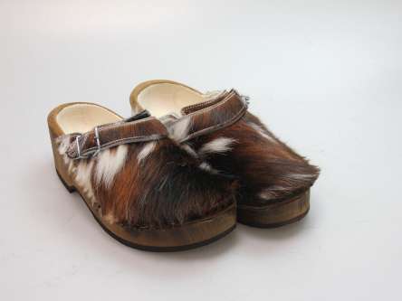 Der Holzschuh, mit dem Sie sicherlich auffallen werden. Außen verwenden wir für dieses Modell Ziegenfell. Für zusätzichen Komfort ist er auch mit Schaffell gefüttert. Im Bild sehen Sie das Unikat, welches Sie erhalten.