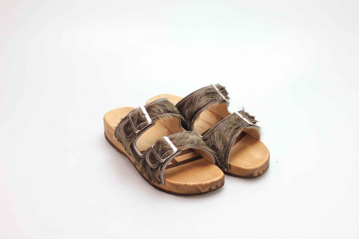 Holzsohle mit eingearbeitetem Fußbett. Die Laufsohle ist aus rutschfestem und abriebfestem PU. Durch die bewegliche Holzsohle ist die Sandale weich und leise beim Auftreten. Mittels zwei Schnallen kann sie dem Fuß perfekt angepasst werden.