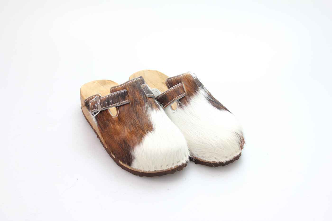 Das Obermaterial ist aus echtem Rindfell und in verschiedenen Farben erhältlich. Durch die Schnalle am Rist/Spann kann er dem Fuß angepasst werden. Im Bild sehen Sie das Exemplar, das Sie erhalten.