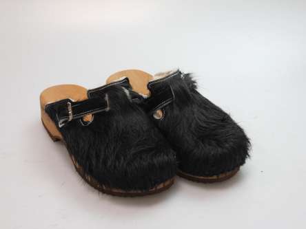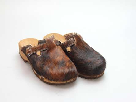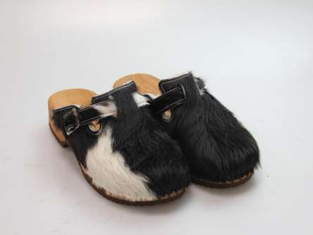 Die Holzsohle ist aus Pappelholz mit eingearbeitetem Fußbett und abriebfester Laufsohle. Das Oberleder ist aus echtem Rindfell. Durch die Schnalle am Rist/Spann kann er dem Fuß angepasst werden.