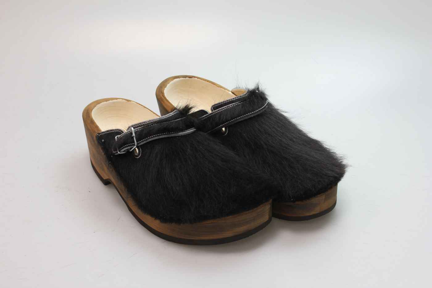 Dieser Holzschuh ist mittels einer Schnalle am Rist/Span verstellbar und ist mit einem Rindsleder gefüttert. Das Obermaterial ist echtes Rindfell. Im Bild sehen Sie das Unikat, welches Sie erhalten.