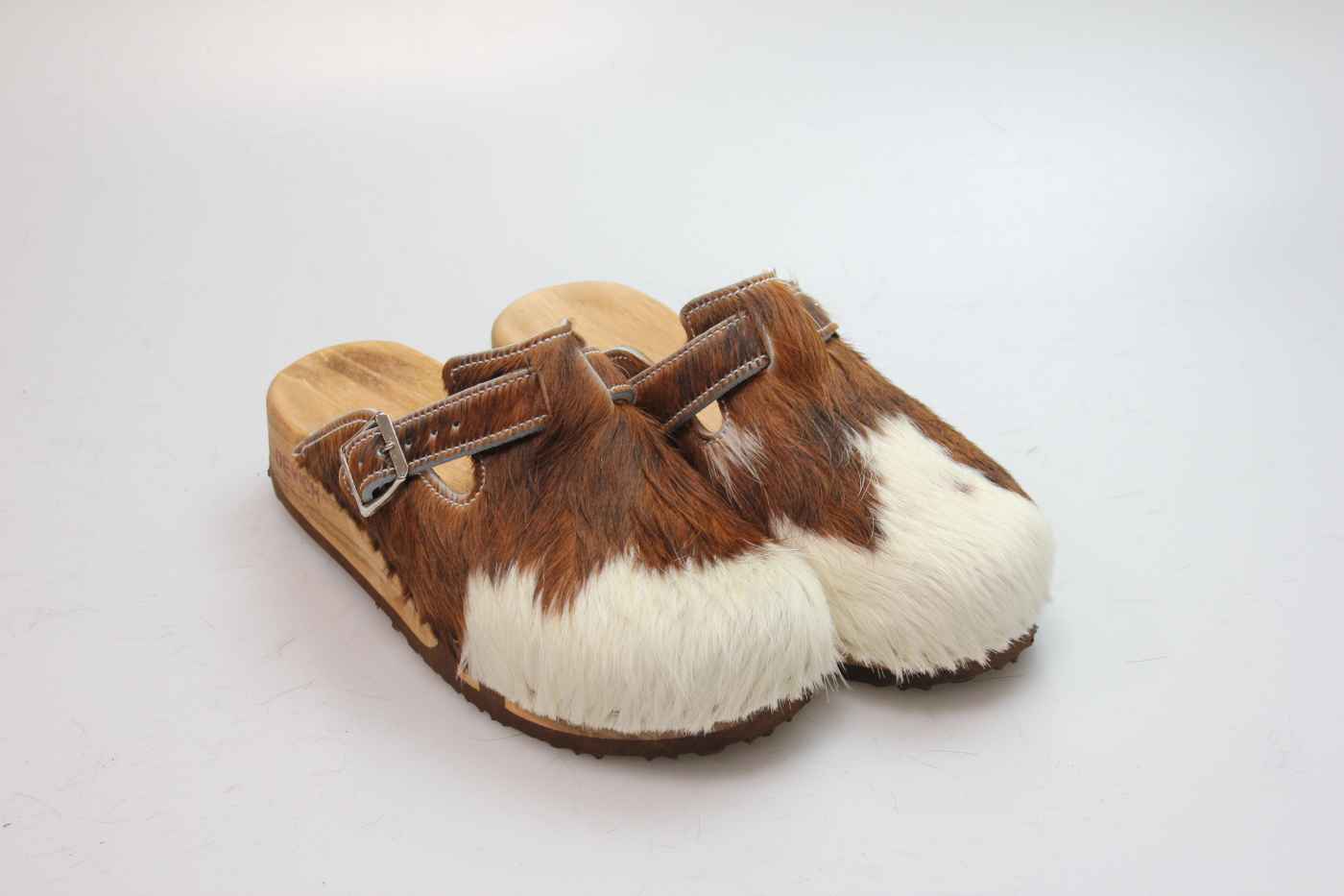 Das Obermaterial ist aus echtem Rindfell und in verschiedenen Farben erhältlich. Durch die Schnalle am Rist/Spann kann er dem Fuß angepasst werden. Im Bild sehen Sie das Exemplar, das Sie erhalten.