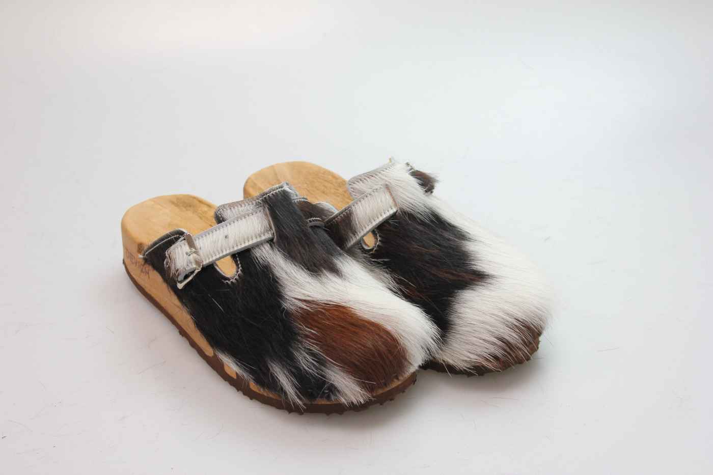 Das Obermaterial ist aus echtem Rindfell und in verschiedenen Farben erhältlich. Durch die Schnalle am Rist/Spann kann er dem Fuß angepasst werden. Im Bild sehen Sie das Exemplar, das Sie erhalten.