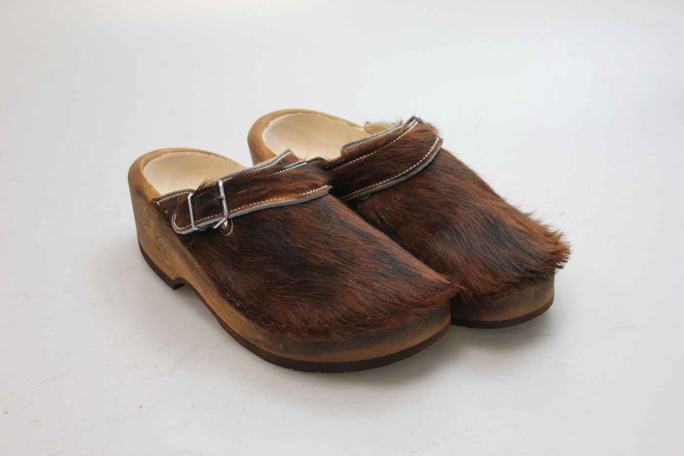 Dieser Holzschuh ist mittels einer Schnalle am Rist/Span verstellbar und ist mit einem Rindsleder gefüttert. Das Obermaterial ist echtes Rindfell. Im Bild sehen Sie das Unikat, welches Sie erhalten.