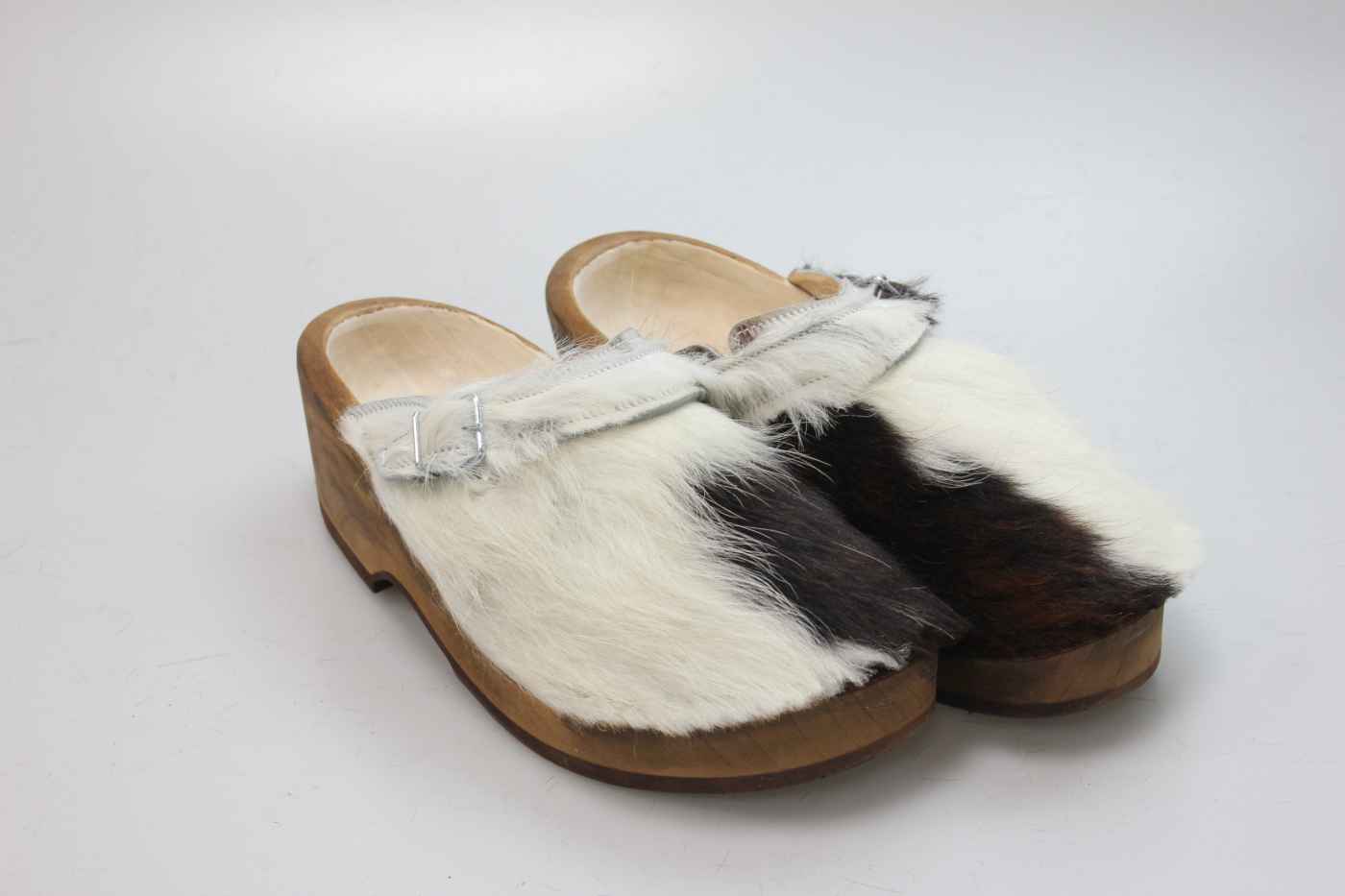 Dieser Holzschuh ist mittels einer Schnalle am Rist/Span verstellbar und ist mit einem Rindsleder gefüttert. Das Obermaterial ist echtes Rindfell. Im Bild sehen Sie das Unikat, welches Sie erhalten.