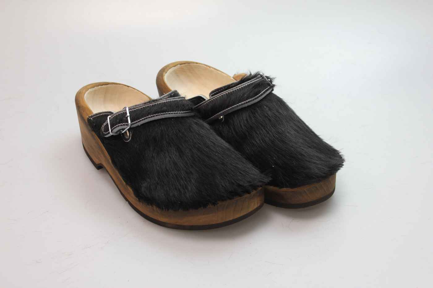 Dieser Holzschuh ist mittels einer Schnalle am Rist/Span verstellbar und ist mit einem Rindsleder gefüttert. Das Obermaterial ist echtes Rindfell. Im Bild sehen Sie das Unikat, welches Sie erhalten.