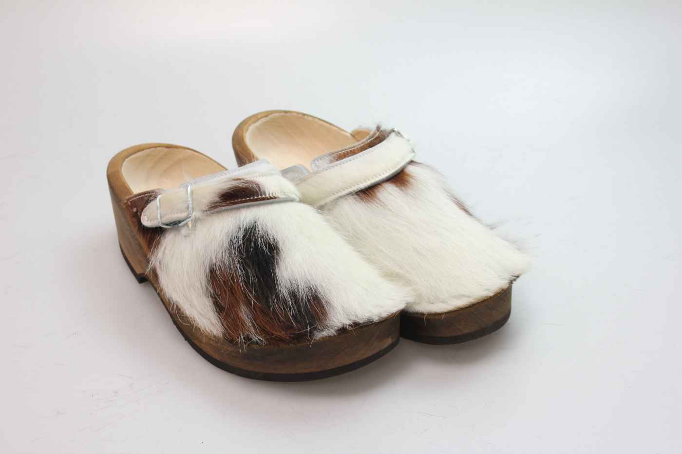 Dieser Holzschuh ist mittels einer Schnalle am Rist/Span verstellbar und ist mit einem Rindsleder gefüttert. Das Obermaterial ist echtes Rindfell. Im Bild sehen Sie das Unikat, welches Sie erhalten.
