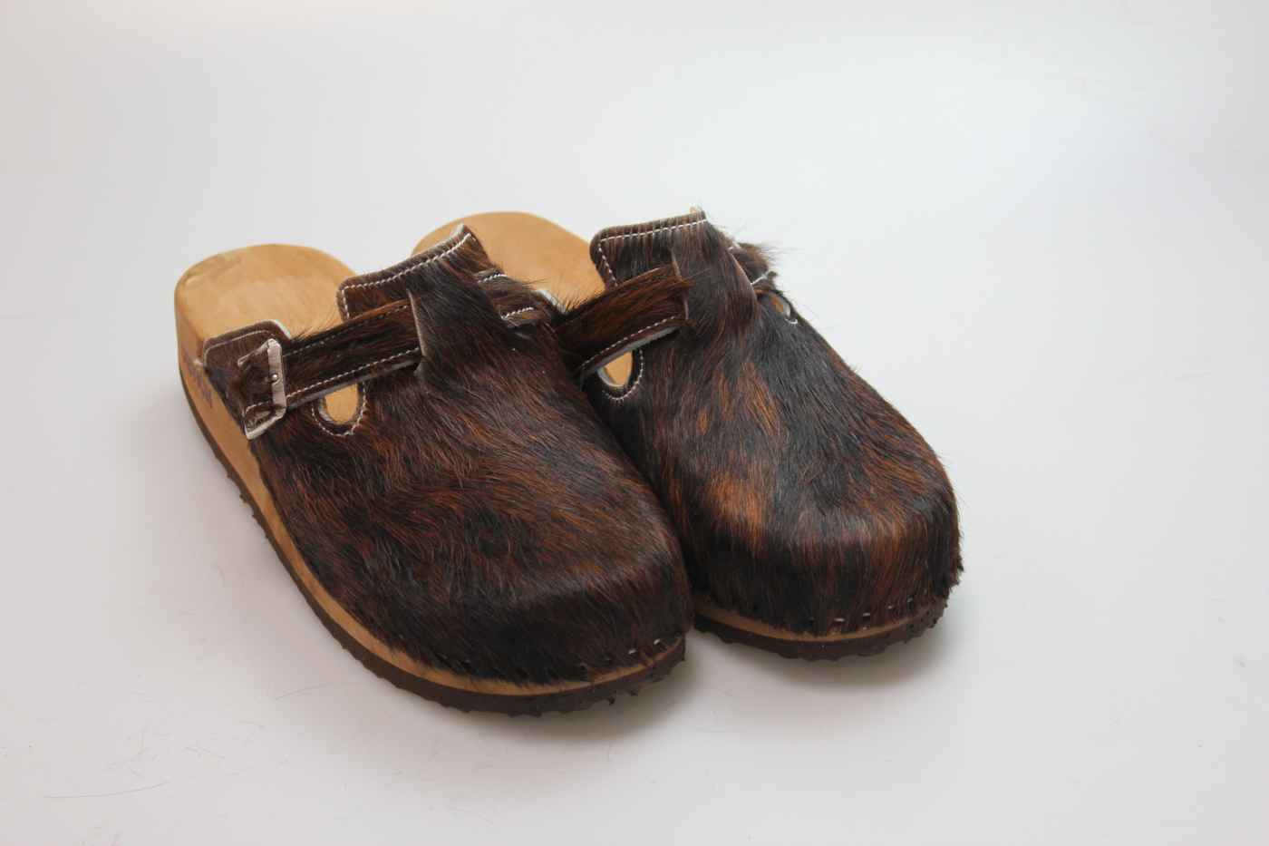 Das Obermaterial ist aus echtem Rindfell und in verschiedenen Farben erhältlich. Durch die Schnalle am Rist/Spann kann er dem Fuß angepasst werden.