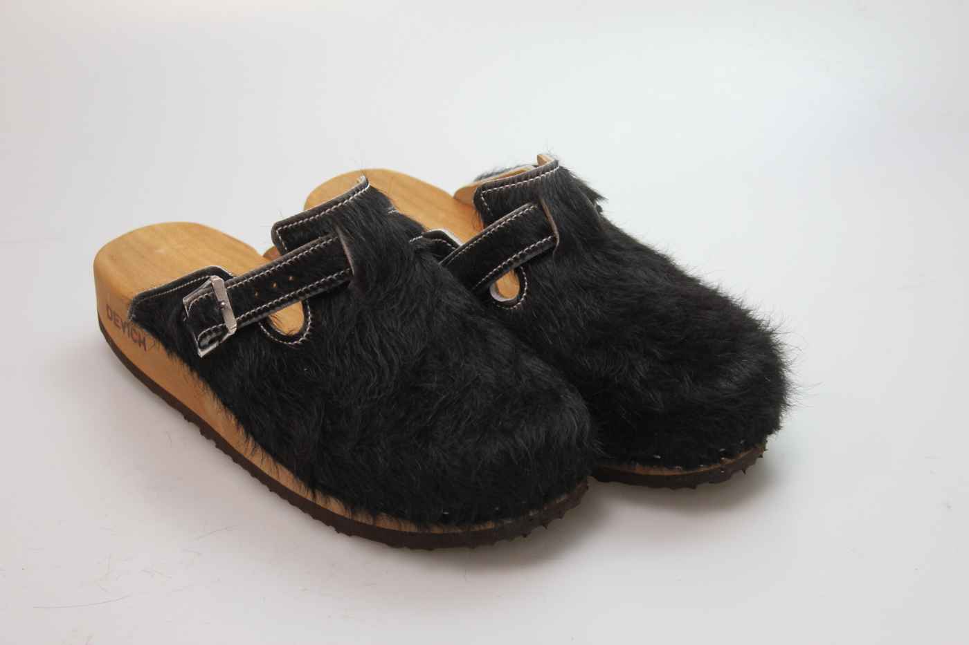 Das Obermaterial ist aus echtem Rindfell und in verschiedenen Farben erhältlich. Durch die Schnalle am Rist/Spann kann er dem Fuß angepasst werden.