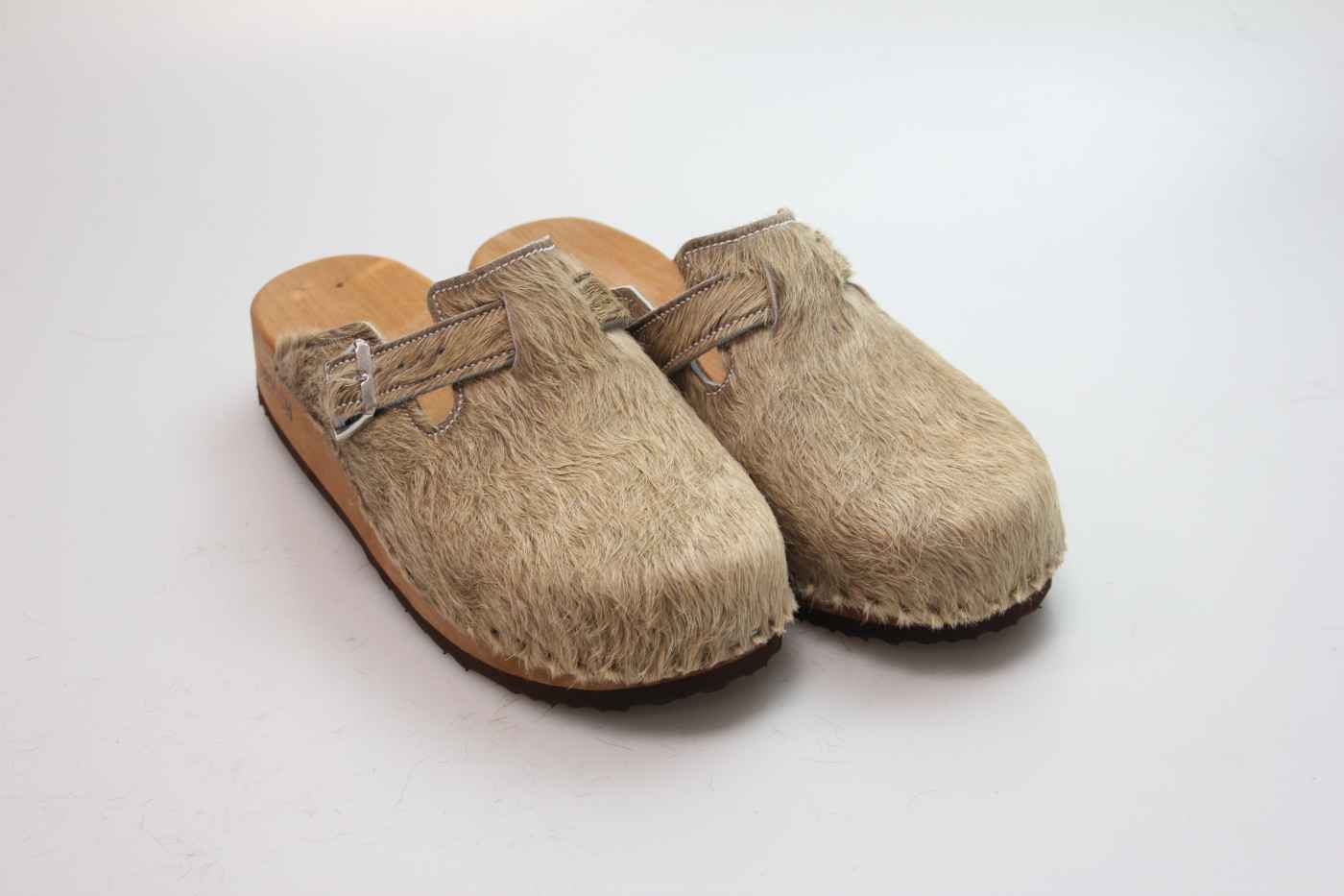 Das Obermaterial ist aus echtem Rindfell und in verschiedenen Farben erhältlich. Durch die Schnalle am Rist/Spann kann er dem Fuß angepasst werden.