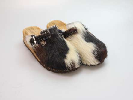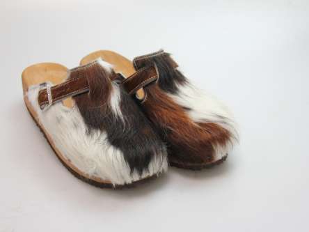 Das Obermaterial ist aus echtem Rindfell und in verschiedenen Farben erhältlich. Durch die Schnalle am Rist/Spann kann er dem Fuß angepasst werden.