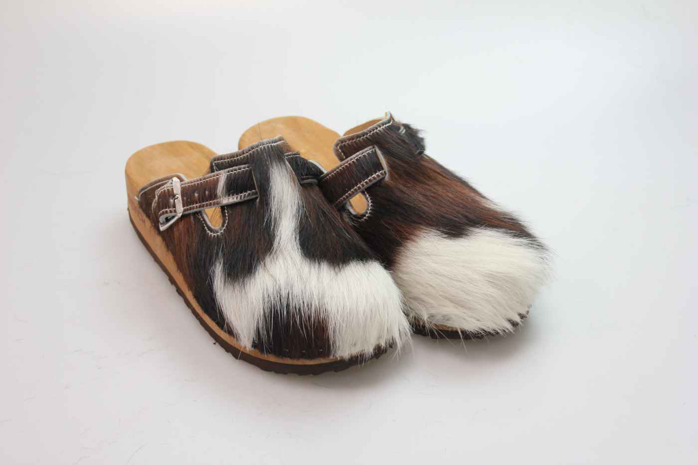 Das Obermaterial ist aus echtem Rindfell und in verschiedenen Farben erhältlich. Durch die Schnalle am Rist/Spann kann er dem Fuß angepasst werden.