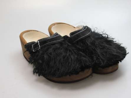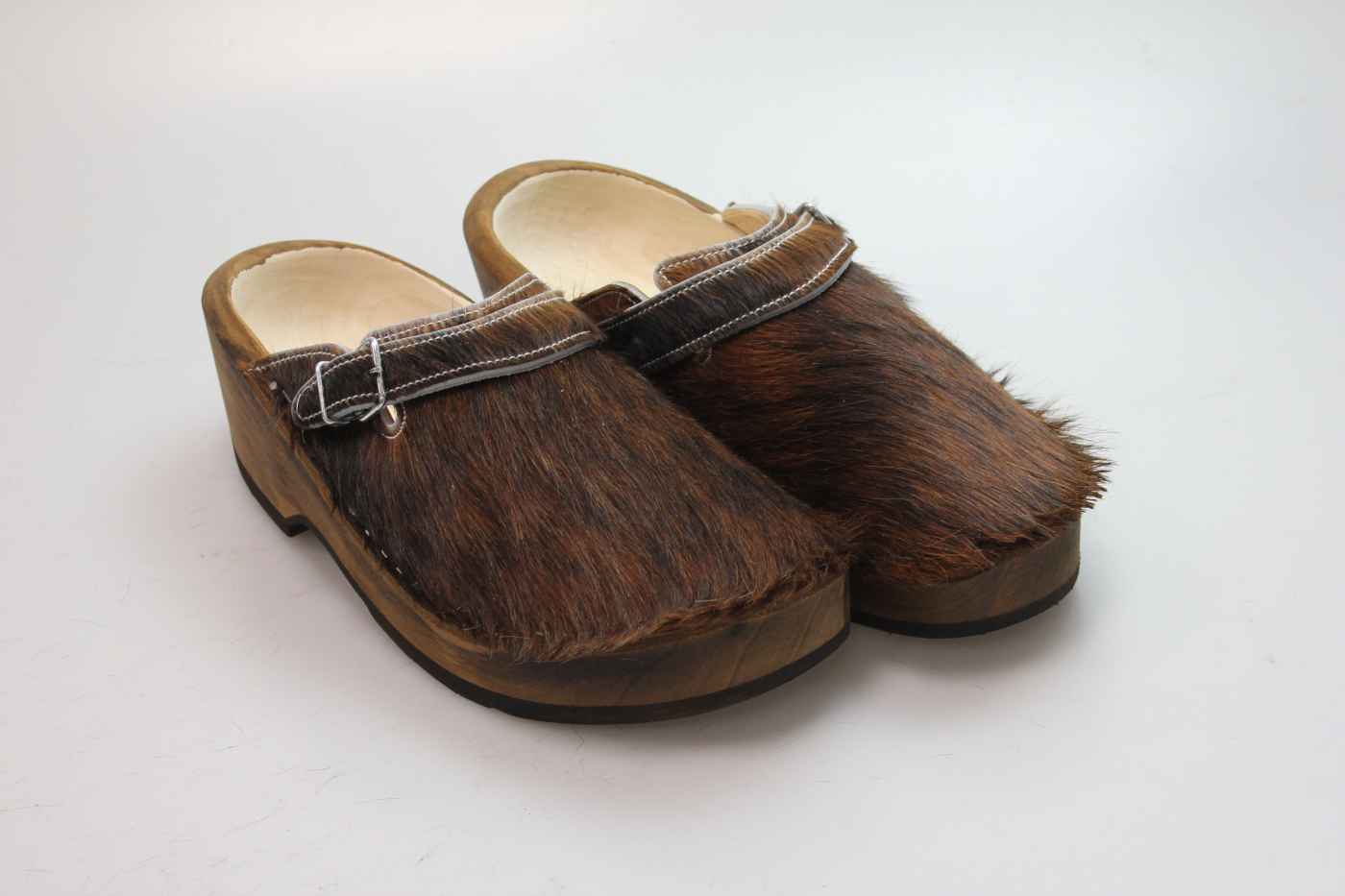 Dieser Holzschuh ist mittels einer Schnalle am Rist/Span verstellbar und ist mit einem Rindsleder gefüttert. Das Obermaterial ist echtes Rindfell. Im Bild sehen Sie das Unikat, welches Sie erhalten.