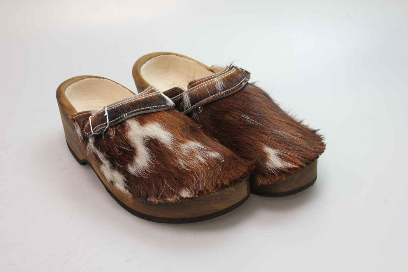 Dieser Holzschuh ist mittels einer Schnalle am Rist/Span verstellbar und ist mit einem Rindsleder gefüttert. Das Obermaterial ist echtes Rindfell. Im Bild sehen Sie das Unikat, welches Sie erhalten.
