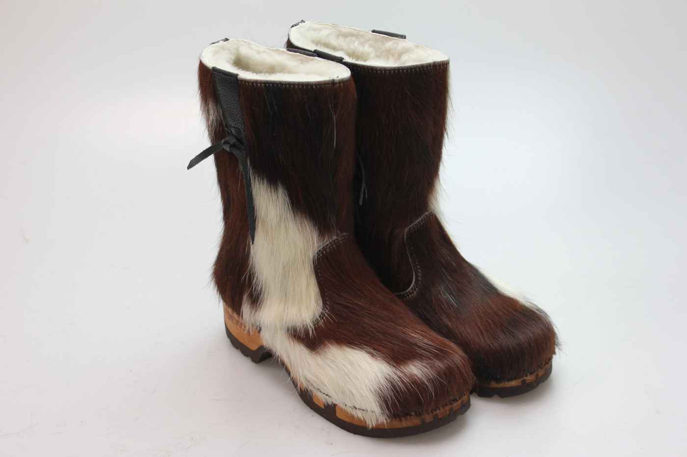 Bequemer Schlüpfstiefel aus Rindfell, mit beweglicher Holzsohle. Die Innenseite ist mit hochwertigem, echtem Schaffell verarbeitet.