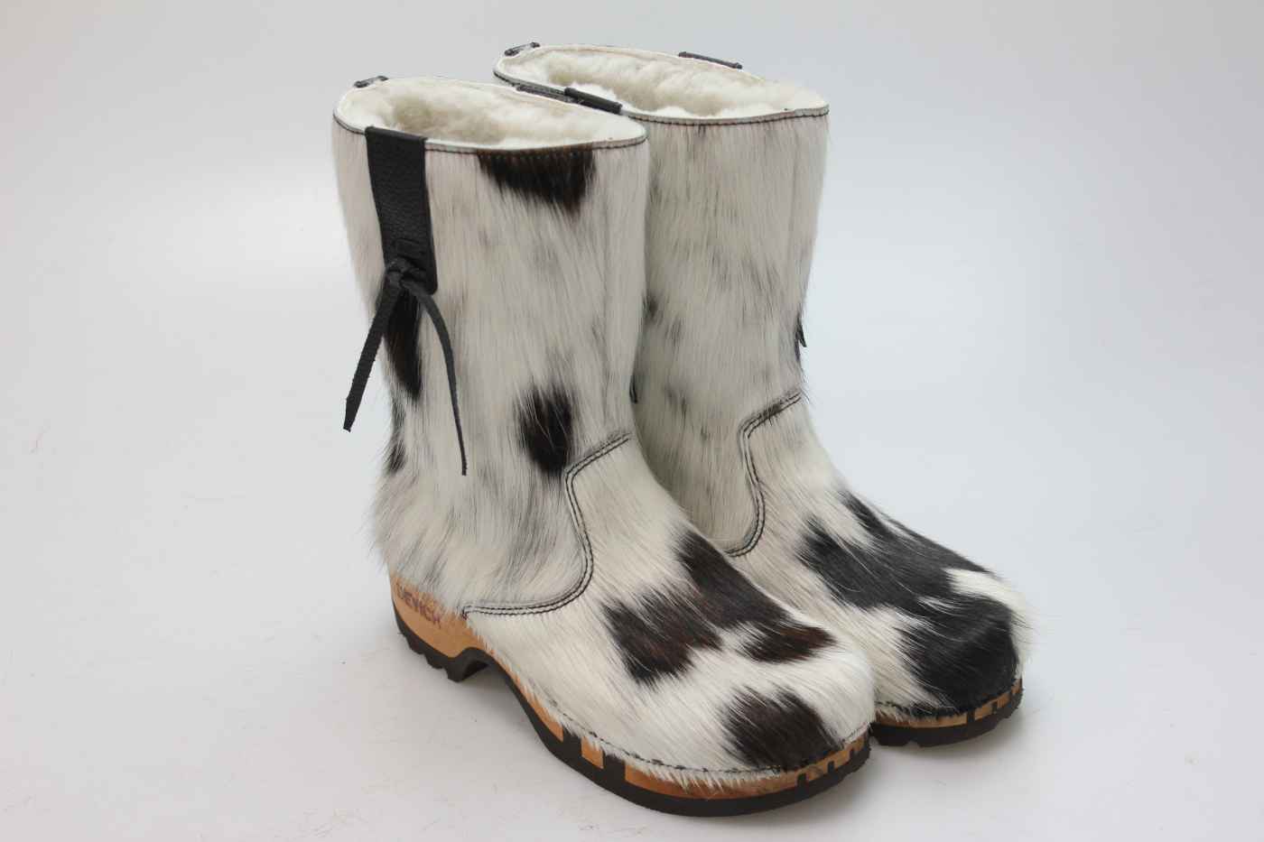 Bequemer Schlüpfstiefel aus Rindfell, mit beweglicher Holzsohle. Die Innenseite ist mit hochwertigem, echtem Schaffell verarbeitet.