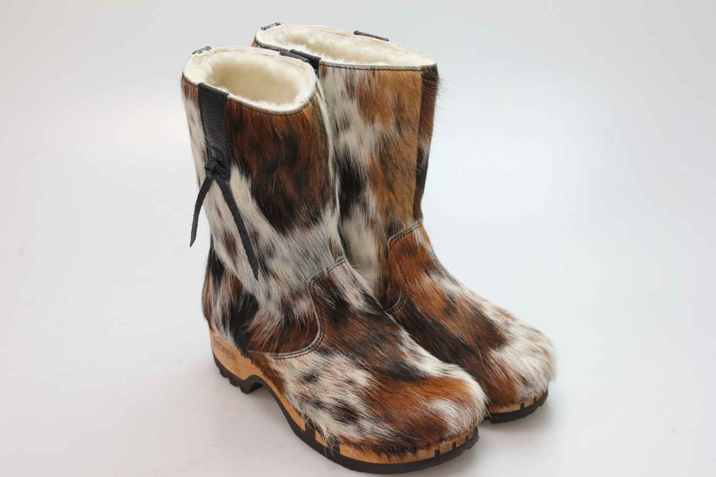Bequemer Schlüpfstiefel aus Rindfell, mit beweglicher Holzsohle. Die Innenseite ist mit hochwertigem, echtem Schaffell verarbeitet.