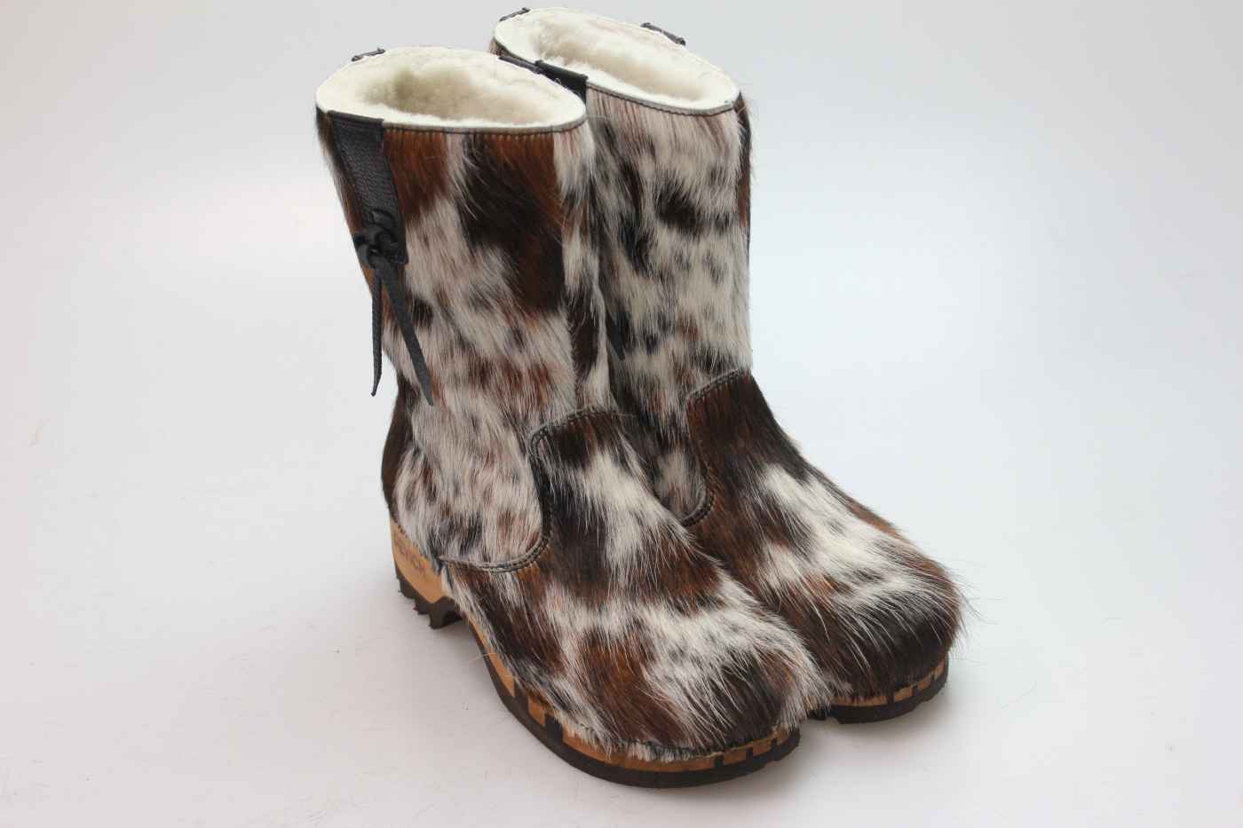 Bequemer Schlüpfstiefel aus Rindfell, mit beweglicher Holzsohle. Die Innenseite ist mit hochwertigem, echtem Schaffell verarbeitet.