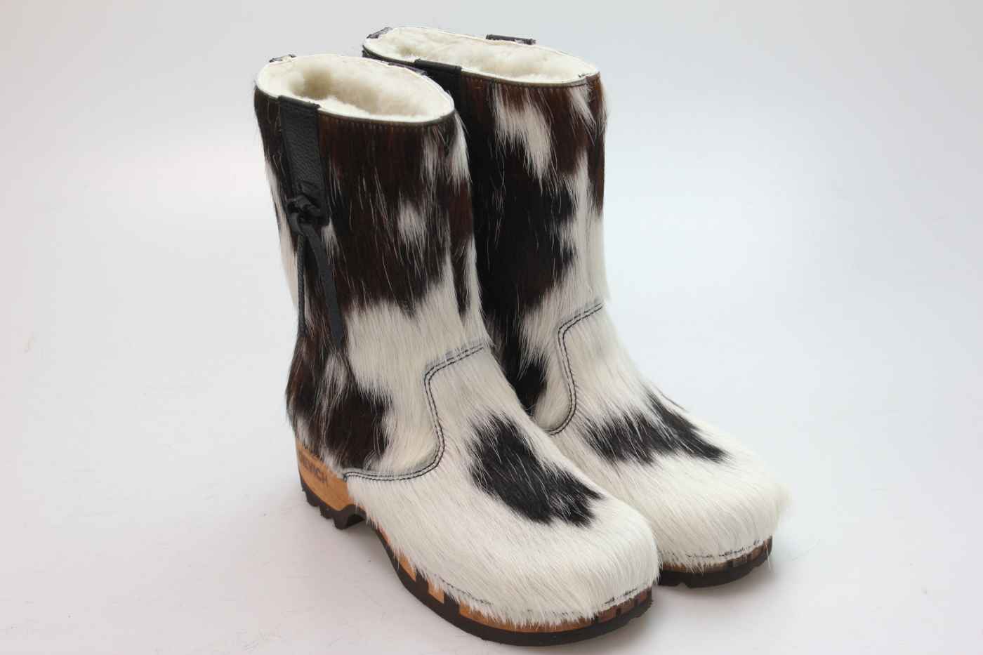 Bequemer Schlüpfstiefel aus Rindfell, mit beweglicher Holzsohle. Die Innenseite ist mit hochwertigem, echtem Schaffell verarbeitet.