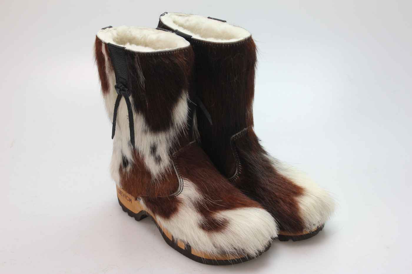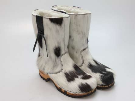 Bequemer Schlüpfstiefel aus Rindfell, mit beweglicher Holzsohle. Die Innenseite ist mit hochwertigem, echtem Schaffell verarbeitet.