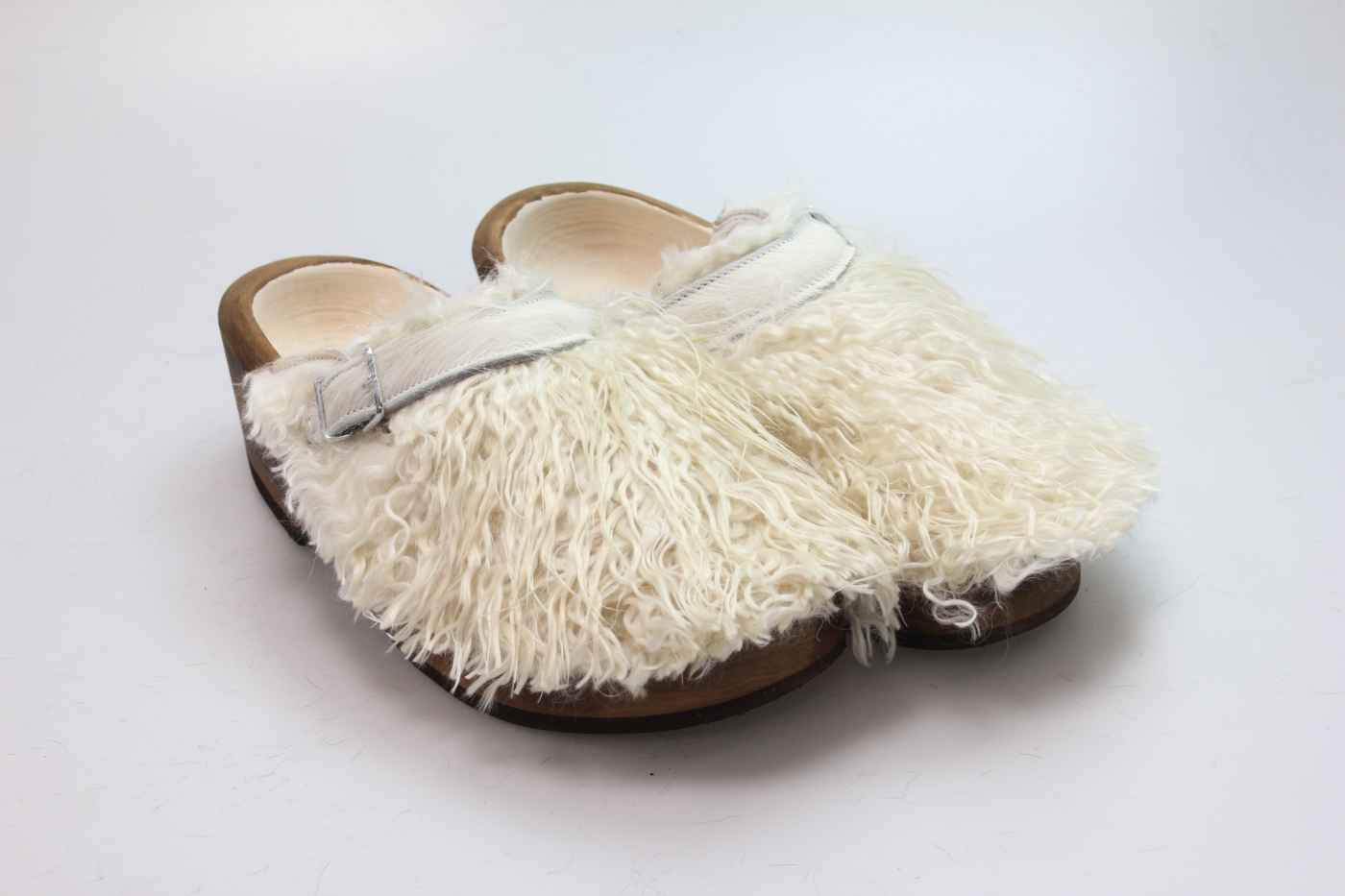 Der Holzschuh, mit dem Sie sicherlich auffallen werden. Außen verwenden wir für dieses Modell Ziegenfell. Für zusätzichen Komfort ist er auch mit Schaffell gefüttert. Im Bild sehen Sie das Unikat, welches Sie erhalten.