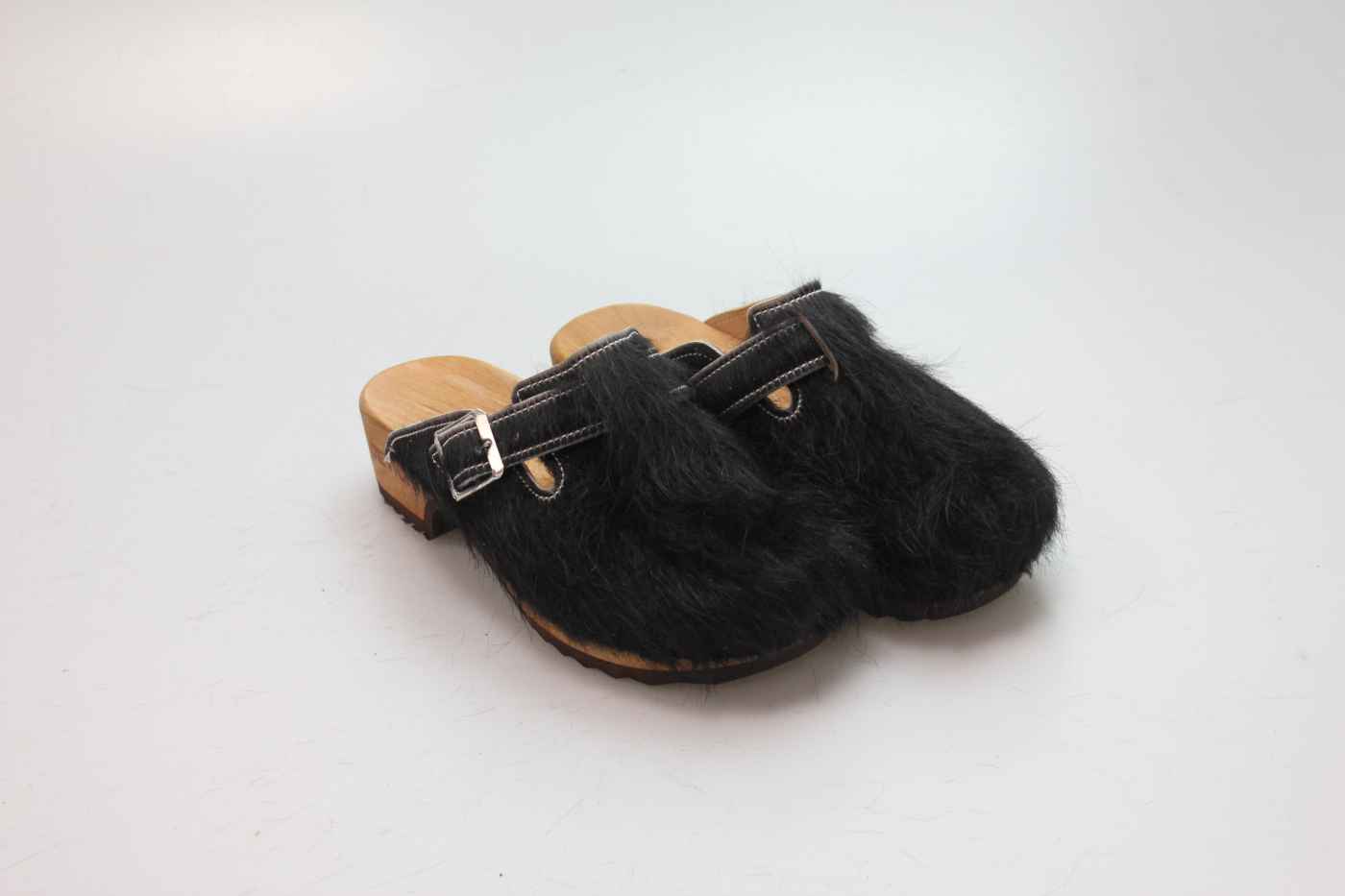 Die Holzsohle ist aus Pappelholz mit eingearbeitetem Fußbett und abriebfester Laufsohle. Das Oberleder ist aus echtem Rindfell. Durch die Schnalle am Rist/Spann kann er dem Fuß angepasst werden.