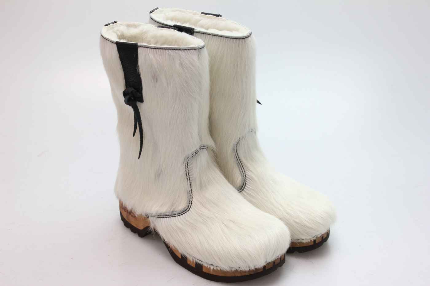 Bequemer Schlüpfstiefel aus Rindfell, mit beweglicher Holzsohle. Die Innenseite ist mit hochwertigem, echtem Schaffell verarbeitet.