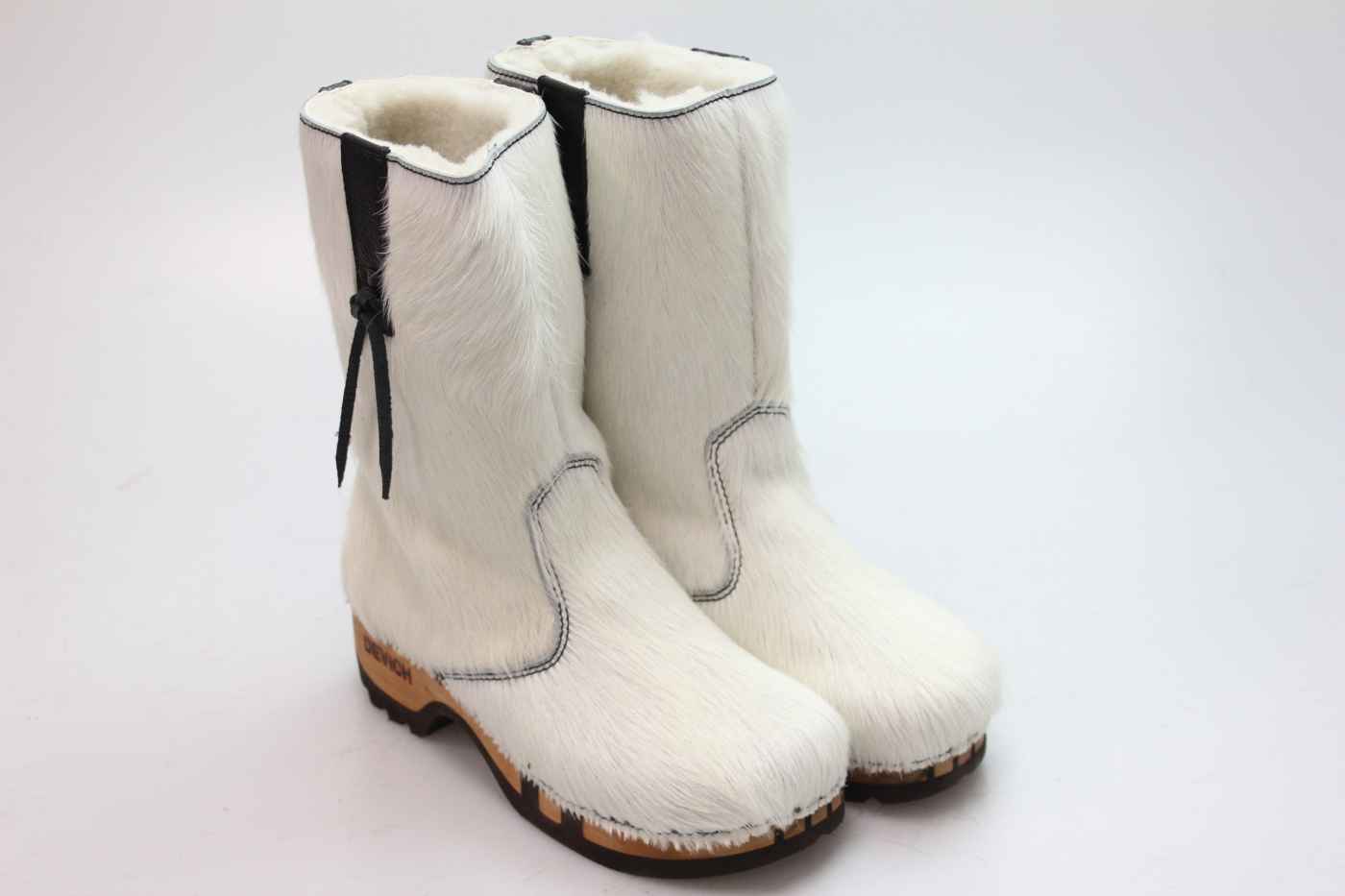 Bequemer Schlüpfstiefel aus Rindfell, mit beweglicher Holzsohle. Die Innenseite ist mit hochwertigem, echtem Schaffell verarbeitet.