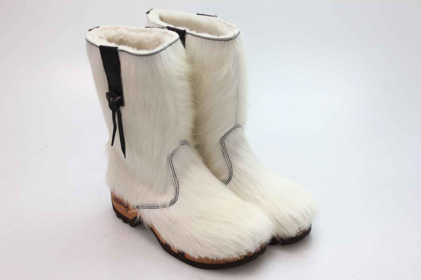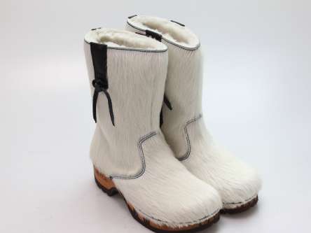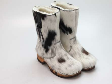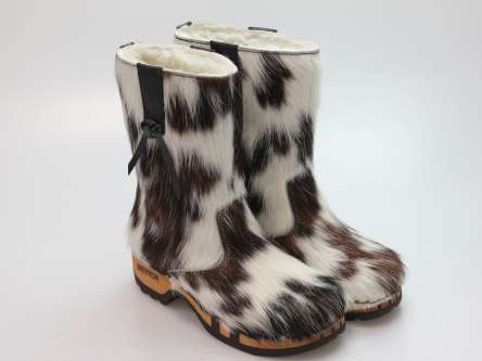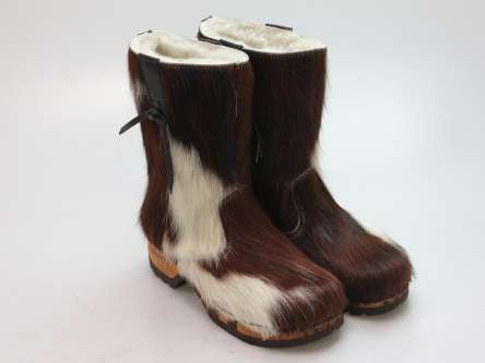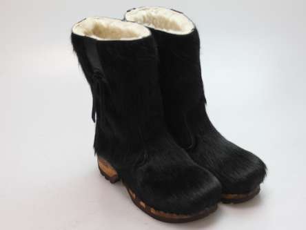 Bequemer Schlüpfstiefel aus Rindfell, mit beweglicher Holzsohle. Die Innenseite ist mit hochwertigem, echtem Schaffell verarbeitet.