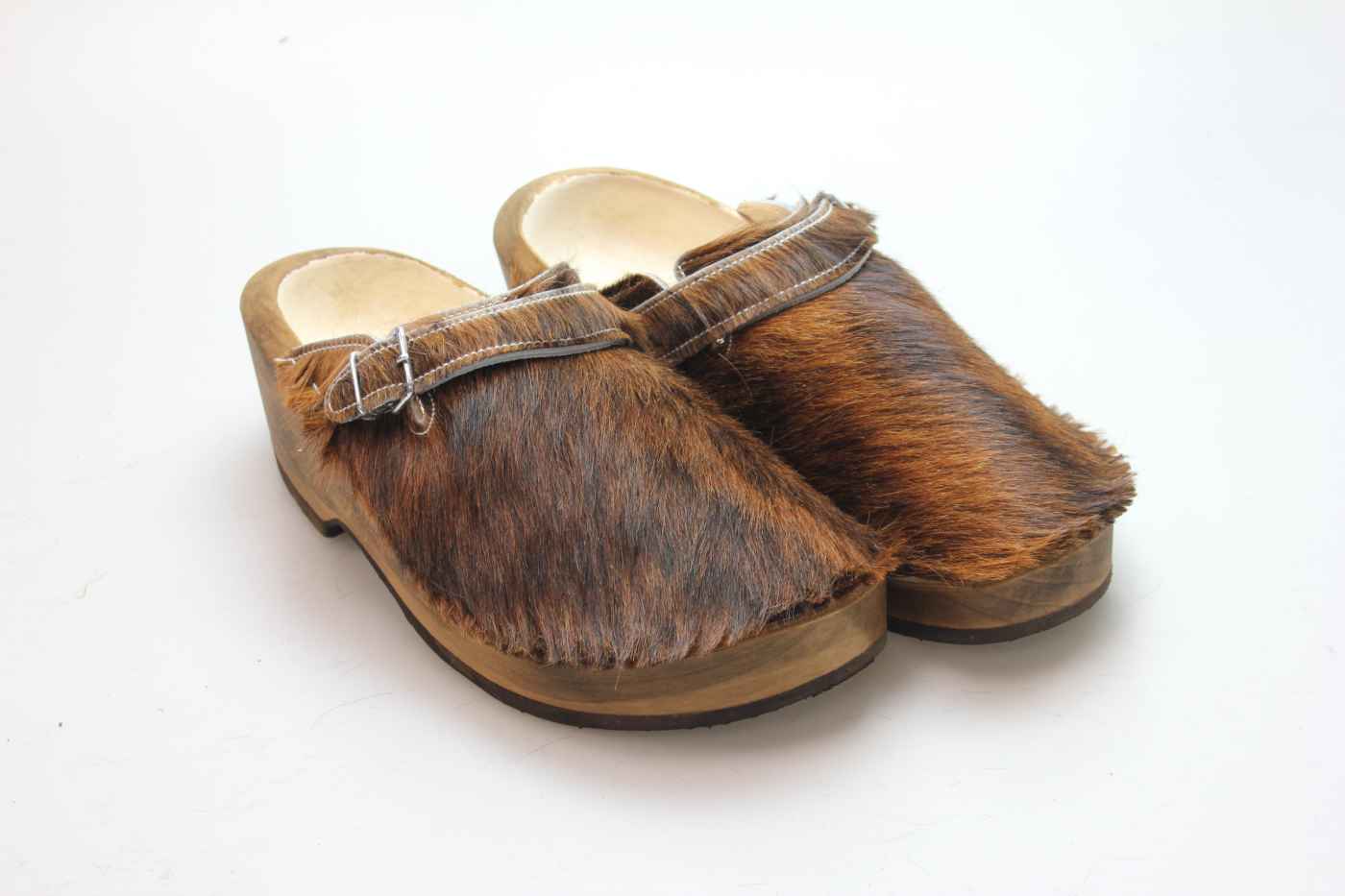 Dieser Holzschuh ist mittels einer Schnalle am Rist/Span verstellbar und ist mit einem Rindsleder gefüttert. Das Obermaterial ist echtes Rindfell. Im Bild sehen Sie das Unikat, welches Sie erhalten.