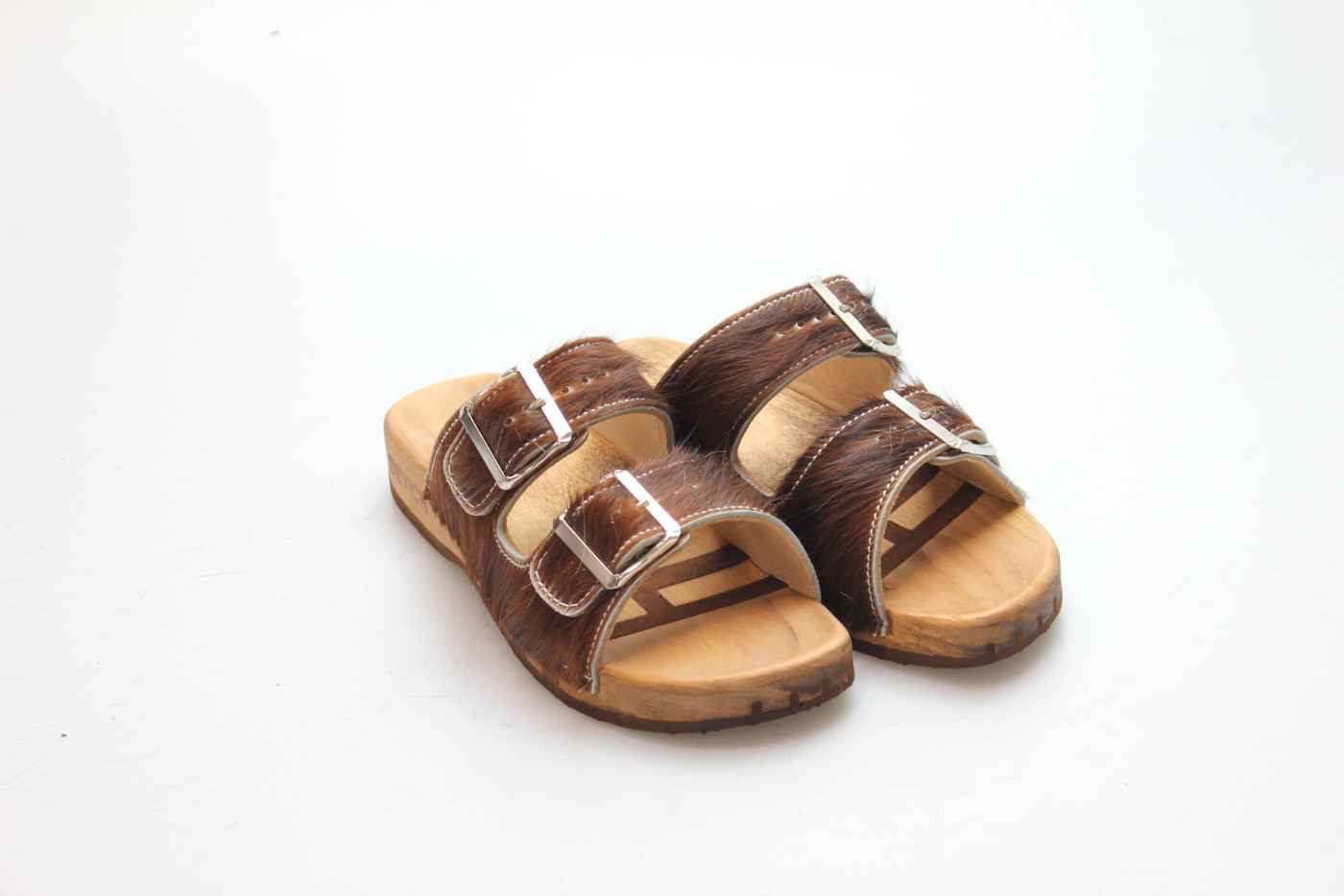 Holzsohle mit eingearbeitetem Fußbett. Die Laufsohle ist aus rutschfestem und abriebfestem PU. Durch die bewegliche Holzsohle ist die Sandale weich und leise beim Auftreten. Mittels zwei Schnallen kann sie dem Fuß perfekt angepasst werden.