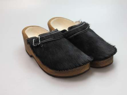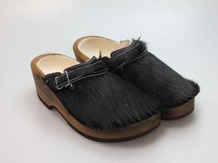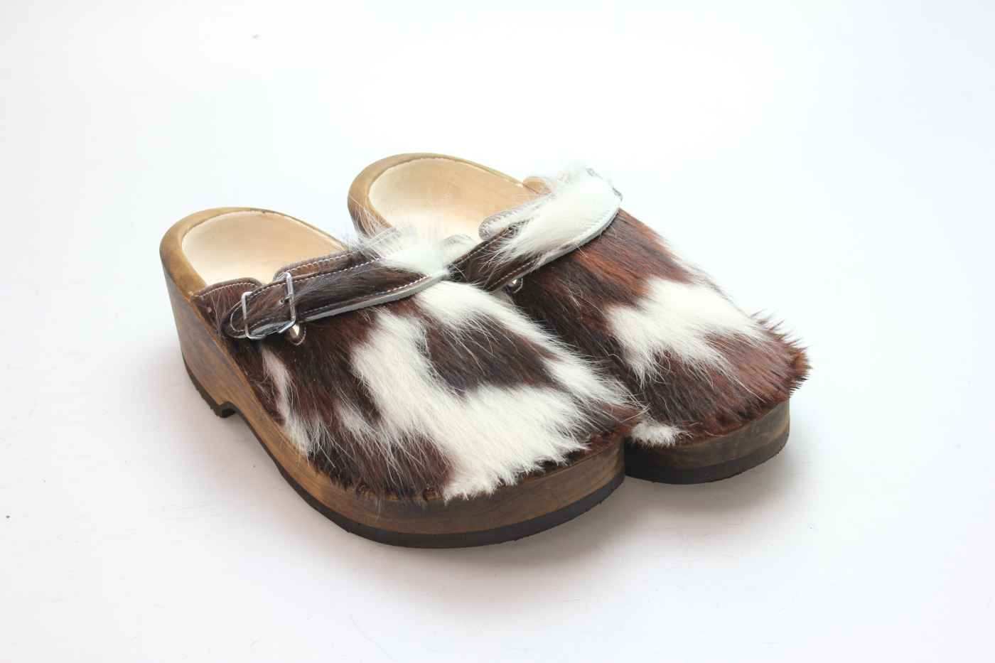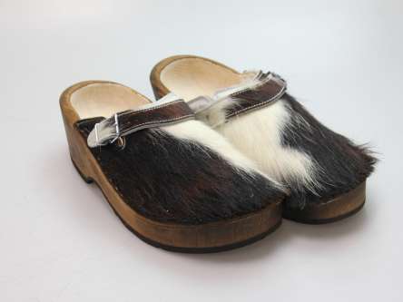 Dieser Holzschuh ist mittels einer Schnalle am Rist/Span verstellbar und ist mit einem Rindsleder gefüttert. Das Obermaterial ist echtes Rindfell. Im Bild sehen Sie das Unikat, welches Sie erhalten.