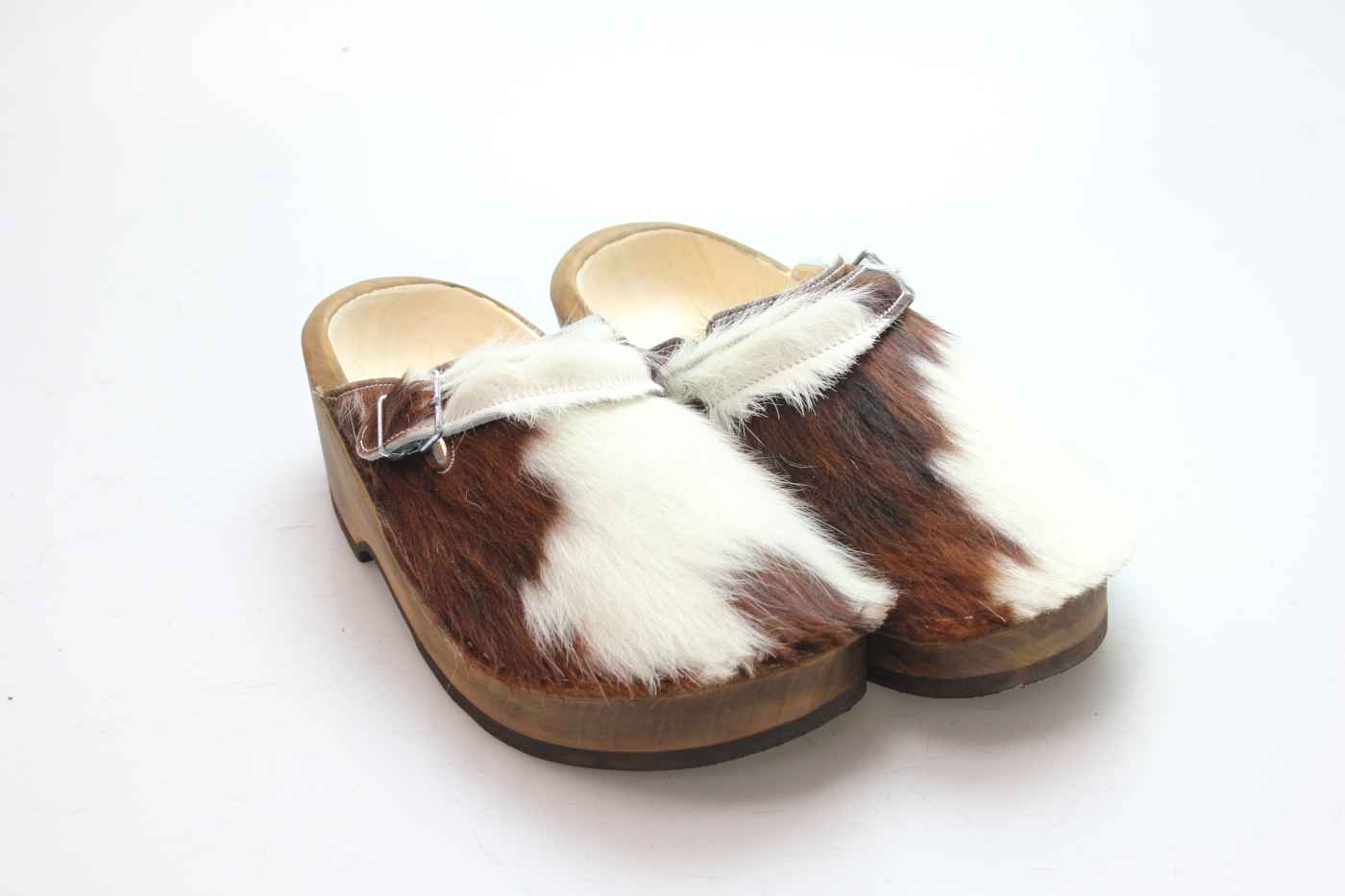 Dieser Holzschuh ist mittels einer Schnalle am Rist/Span verstellbar und ist mit einem Rindsleder gefüttert. Das Obermaterial ist echtes Rindfell. Im Bild sehen Sie das Unikat, welches Sie erhalten.
