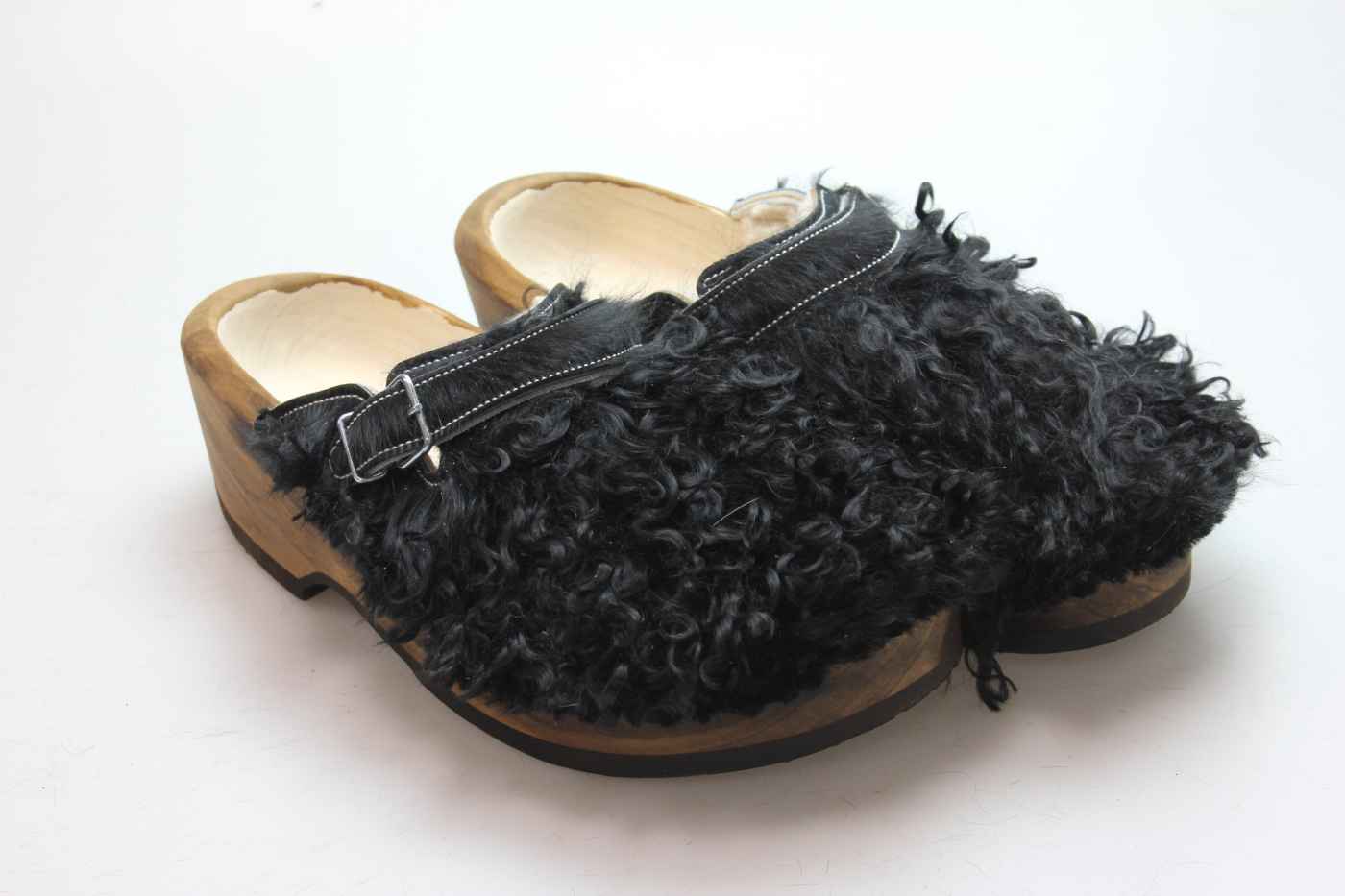 Der Holzschuh, mit dem Sie sicherlich auffallen werden. Außen verwenden wir für dieses Modell Ziegenfell. Für zusätzichen Komfort ist er auch mit Schaffell gefüttert. Im Bild sehen Sie das Unikat, welches Sie erhalten.