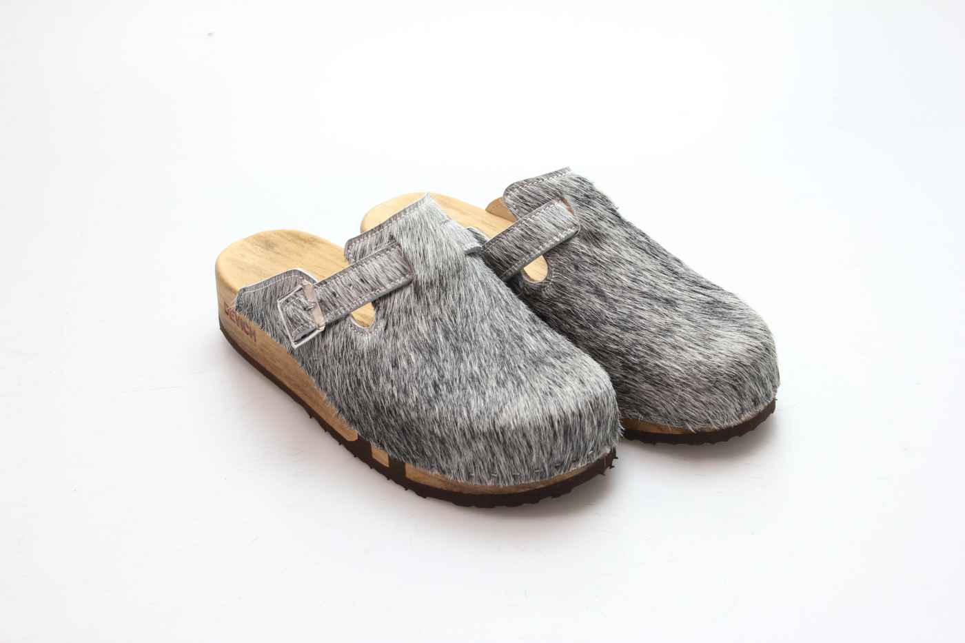 Das Obermaterial ist aus echtem Rindfell und in verschiedenen Farben erhältlich. Durch die Schnalle am Rist/Spann kann er dem Fuß angepasst werden. Im Bild sehen Sie das Exemplar, das Sie erhalten.