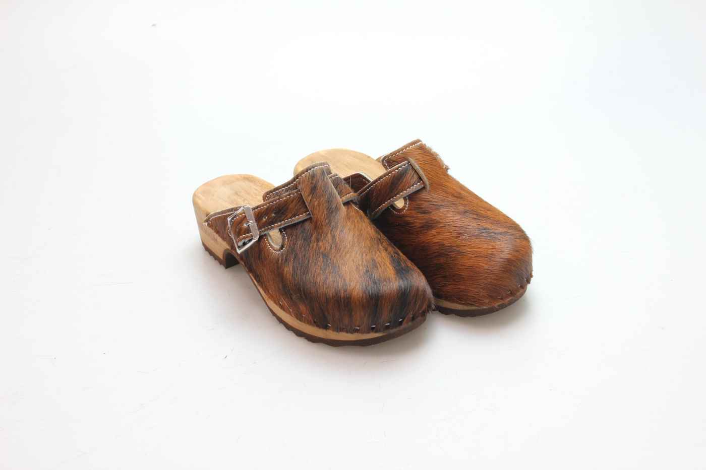 Die Holzsohle ist aus Pappelholz mit eingearbeitetem Fußbett und abriebfester Laufsohle. Das Oberleder ist aus echtem Rindfell. Durch die Schnalle am Rist/Spann kann er dem Fuß angepasst werden.