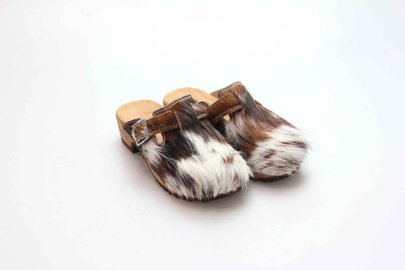 Die Holzsohle ist aus Pappelholz mit eingearbeitetem Fußbett und abriebfester Laufsohle. Das Oberleder ist aus echtem Rindfell. Durch die Schnalle am Rist/Spann kann er dem Fuß angepasst werden.