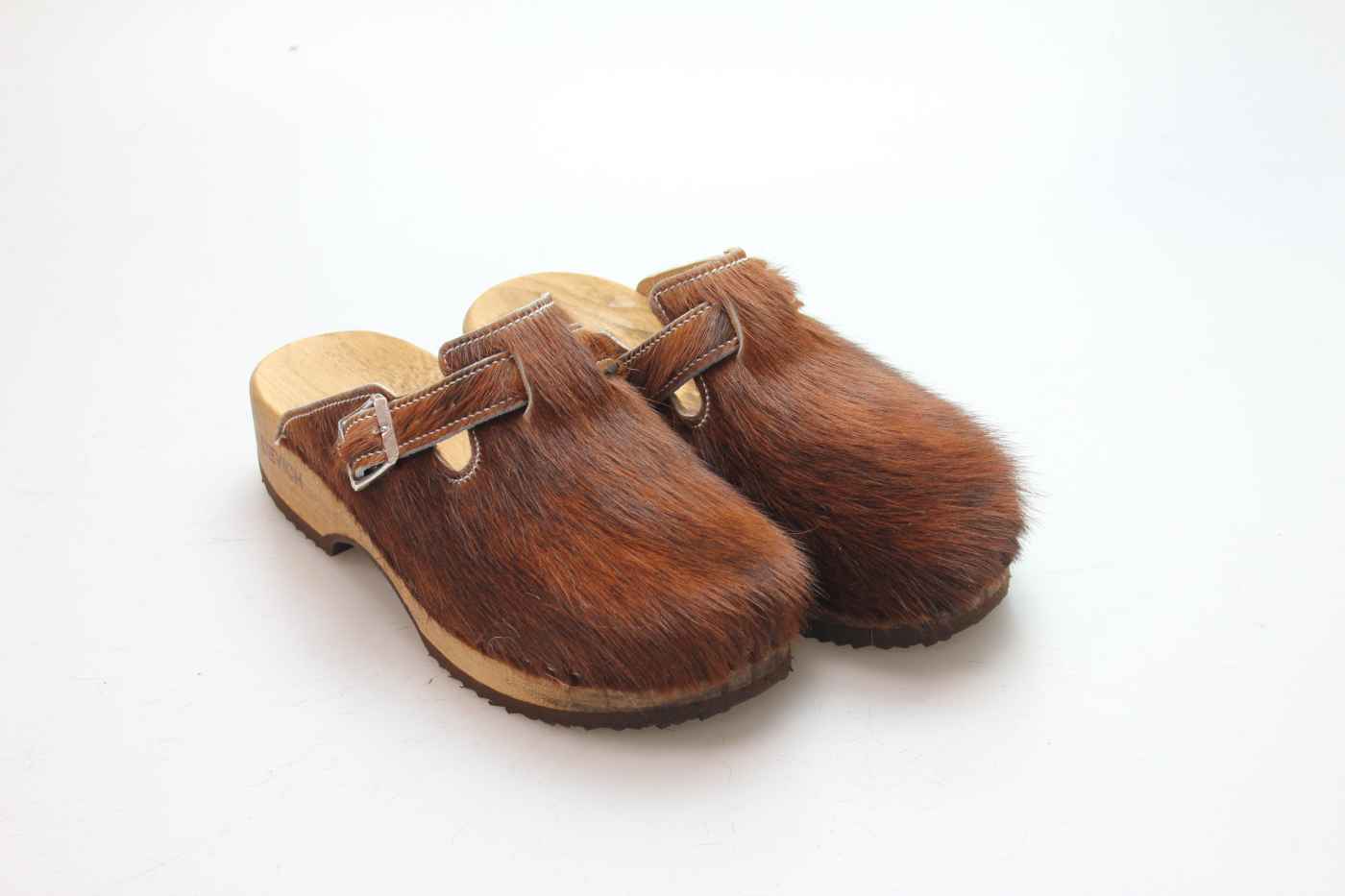 Die Holzsohle ist aus Pappelholz mit eingearbeitetem Fußbett und abriebfester Laufsohle. Das Oberleder ist aus echtem Rindfell. Durch die Schnalle am Rist/Spann kann er dem Fuß angepasst werden.