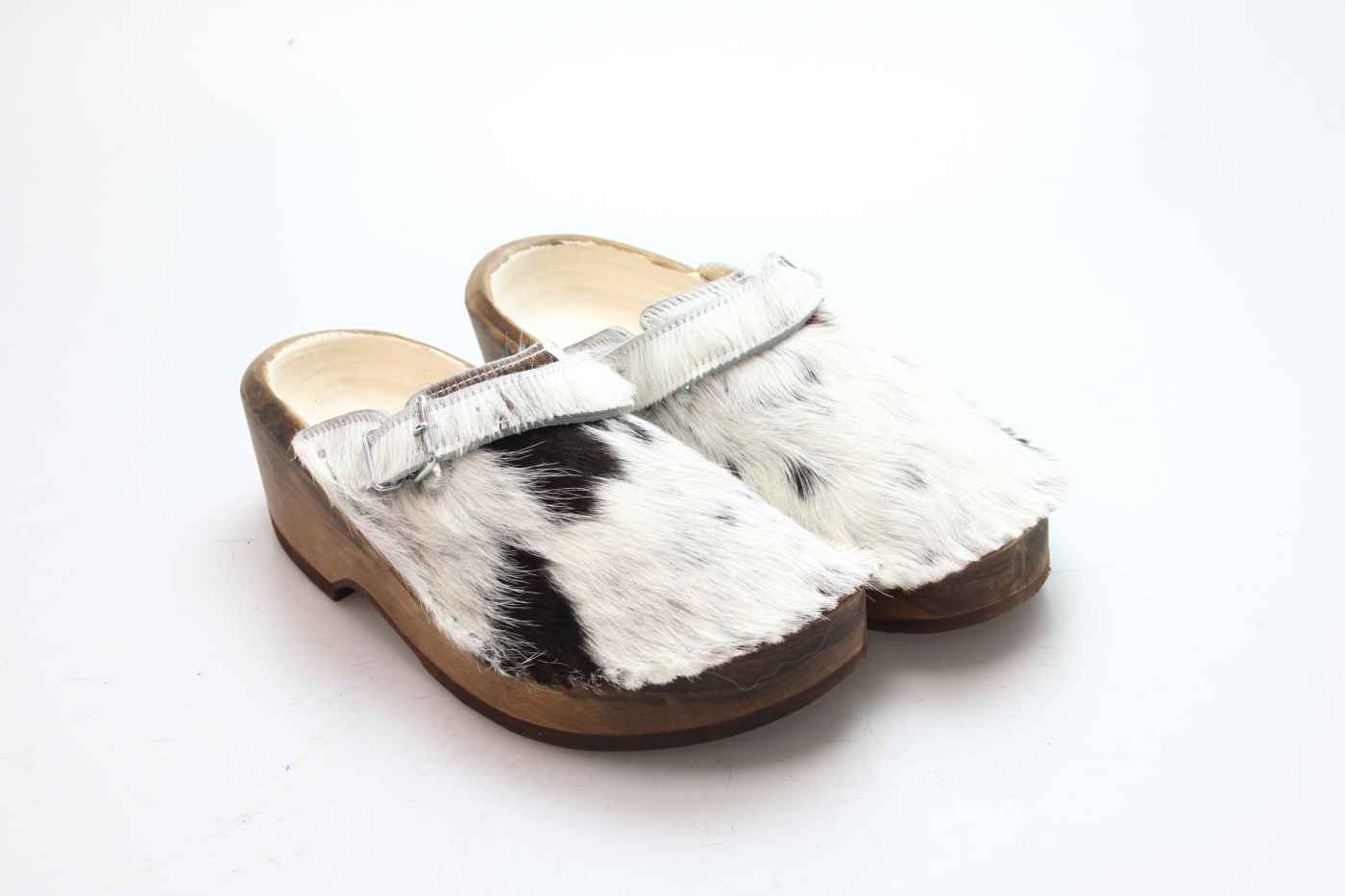 Dieser Holzschuh ist mittels einer Schnalle am Rist/Span verstellbar und ist mit einem Rindsleder gefüttert. Das Obermaterial ist echtes Rindfell. Im Bild sehen Sie das Unikat, welches Sie erhalten.