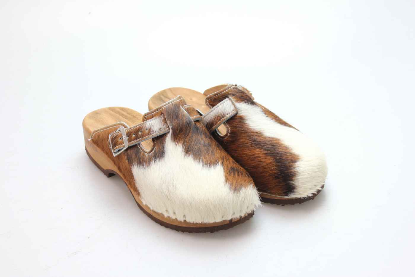 Die Holzsohle ist aus Pappelholz mit eingearbeitetem Fußbett und abriebfester Laufsohle. Das Oberleder ist aus echtem Rindfell. Durch die Schnalle am Rist/Spann kann er dem Fuß angepasst werden.