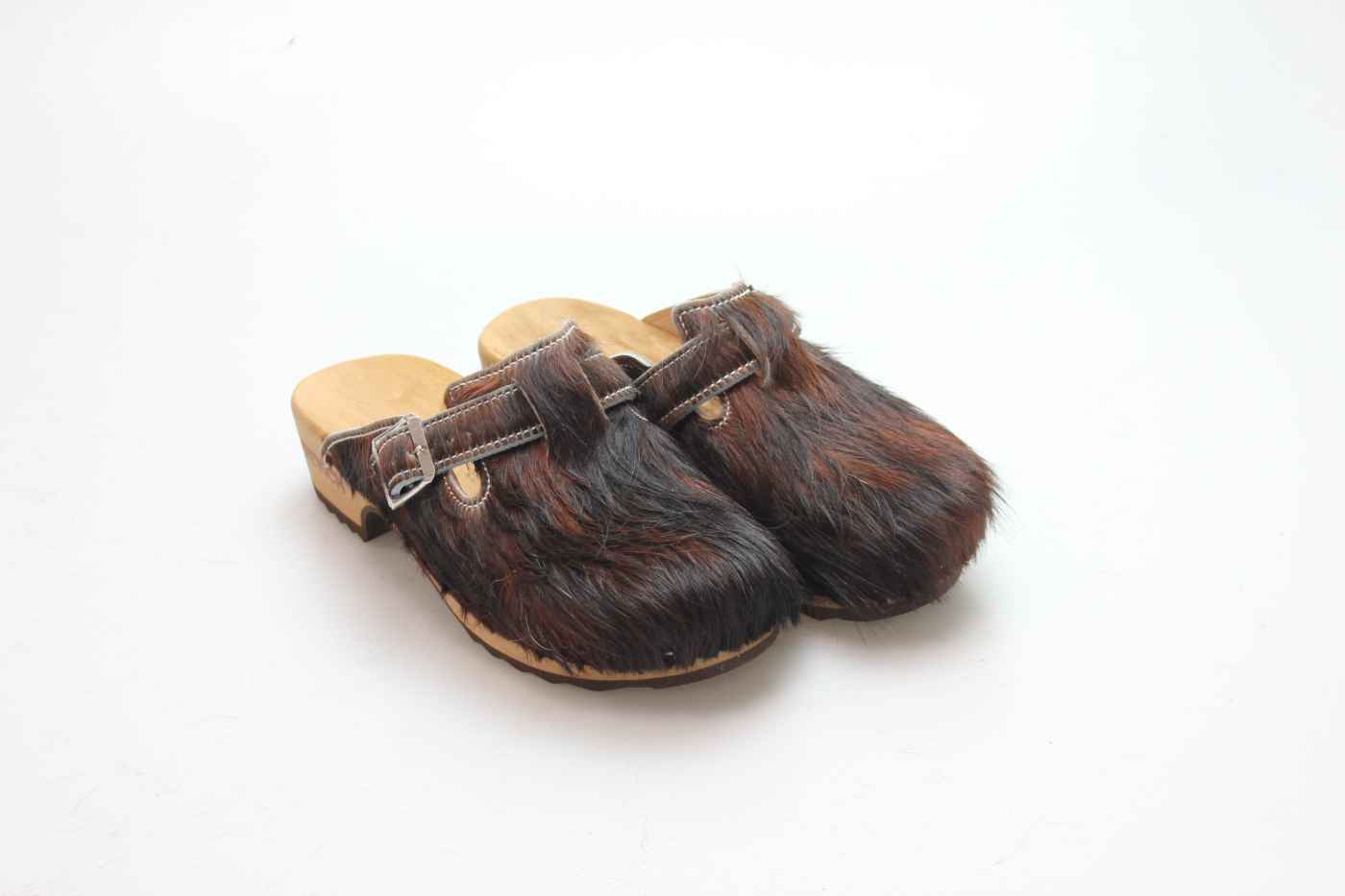 Die Holzsohle ist aus Pappelholz mit eingearbeitetem Fußbett und abriebfester Laufsohle. Das Oberleder ist aus echtem Rindfell. Durch die Schnalle am Rist/Spann kann er dem Fuß angepasst werden.