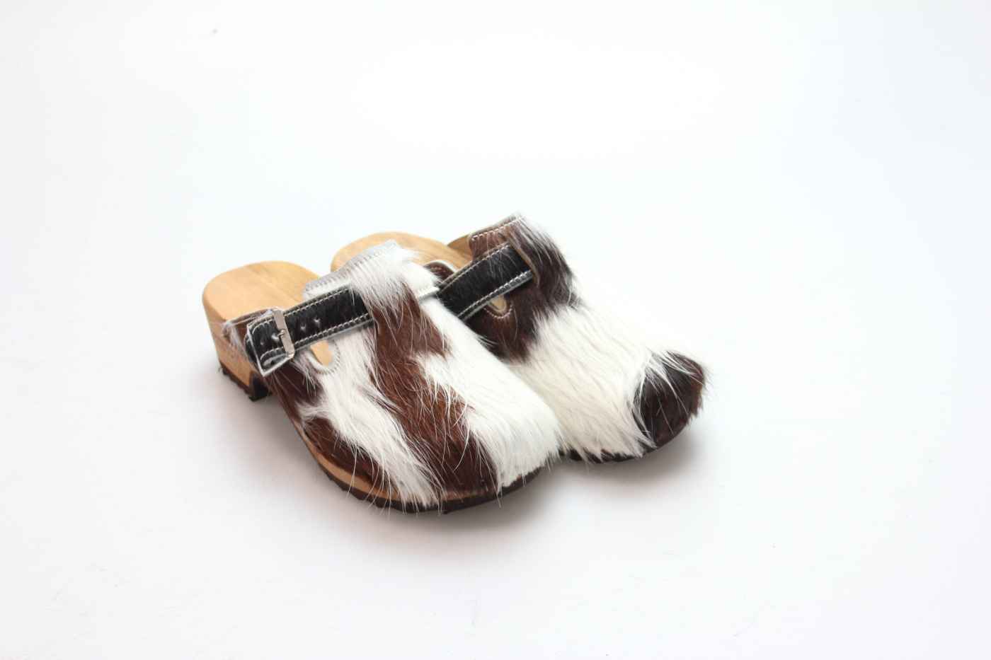 Die Holzsohle ist aus Pappelholz mit eingearbeitetem Fußbett und abriebfester Laufsohle. Das Oberleder ist aus echtem Rindfell. Durch die Schnalle am Rist/Spann kann er dem Fuß angepasst werden.