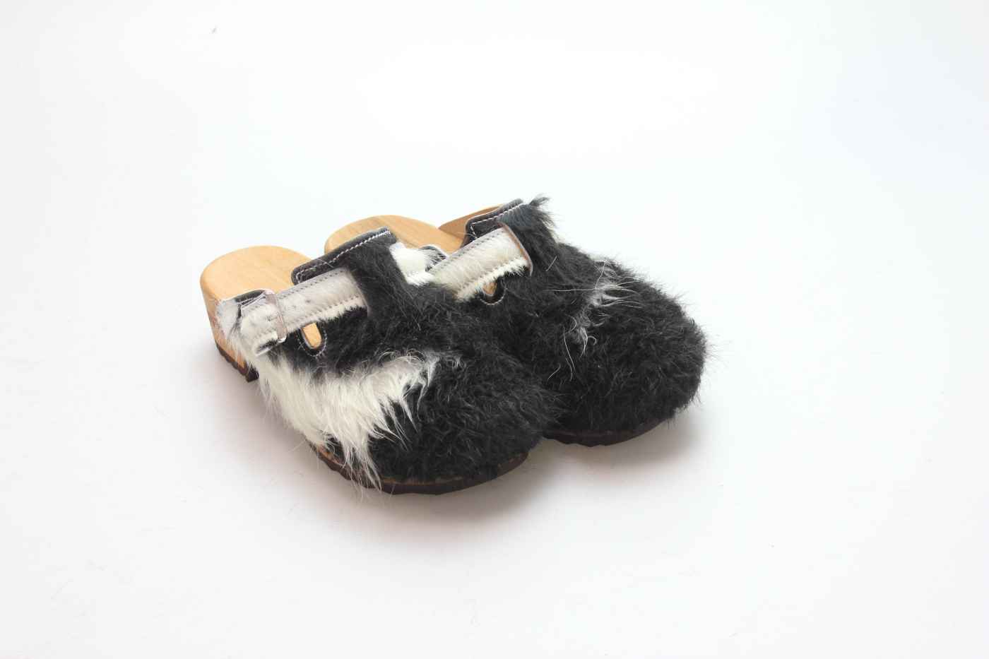Die Holzsohle ist aus Pappelholz mit eingearbeitetem Fußbett und abriebfester Laufsohle. Das Oberleder ist aus echtem Rindfell. Durch die Schnalle am Rist/Spann kann er dem Fuß angepasst werden.