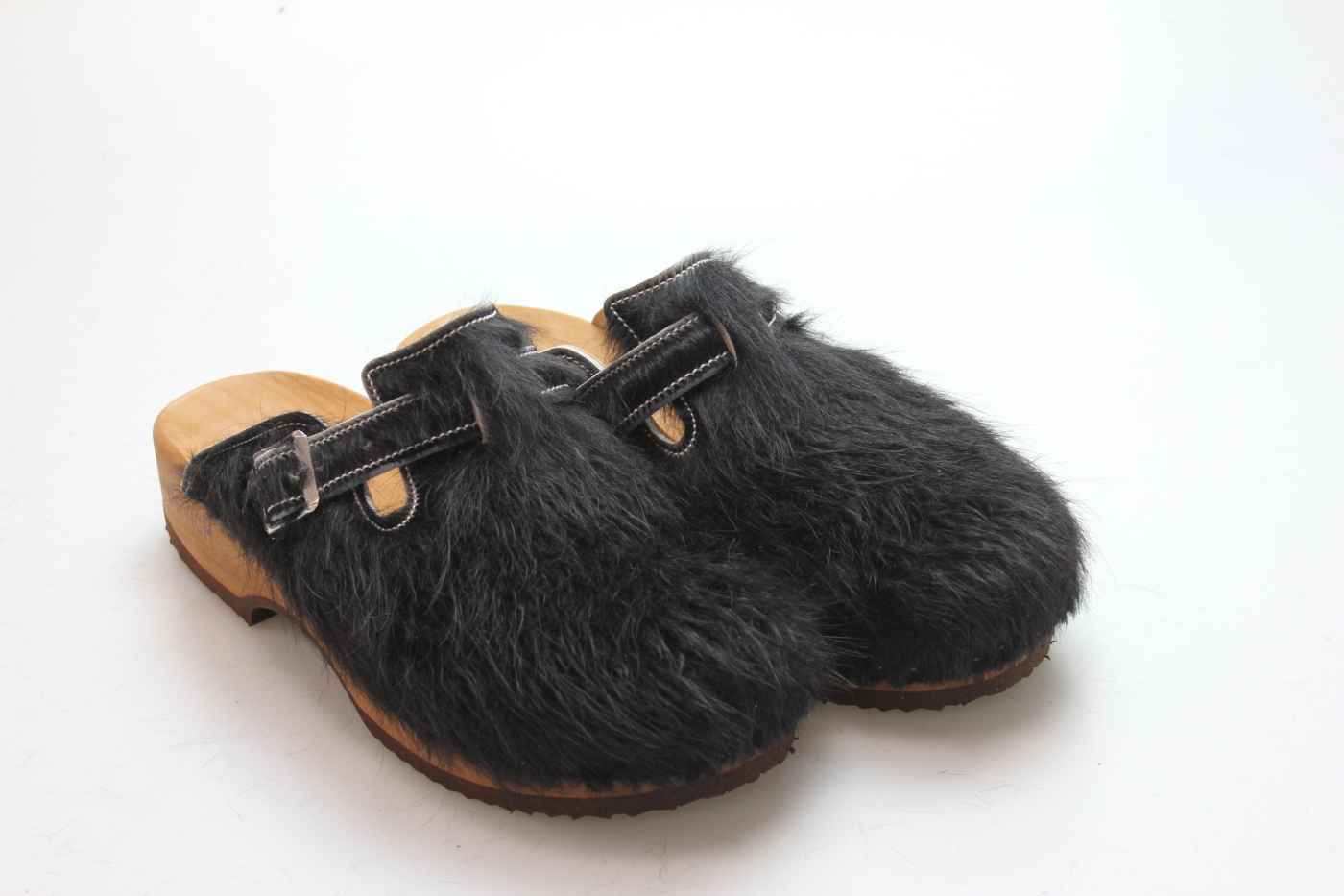 Die Holzsohle ist aus Pappelholz mit eingearbeitetem Fußbett und abriebfester Laufsohle. Das Oberleder ist aus echtem Rindfell. Durch die Schnalle am Rist/Spann kann er dem Fuß angepasst werden.