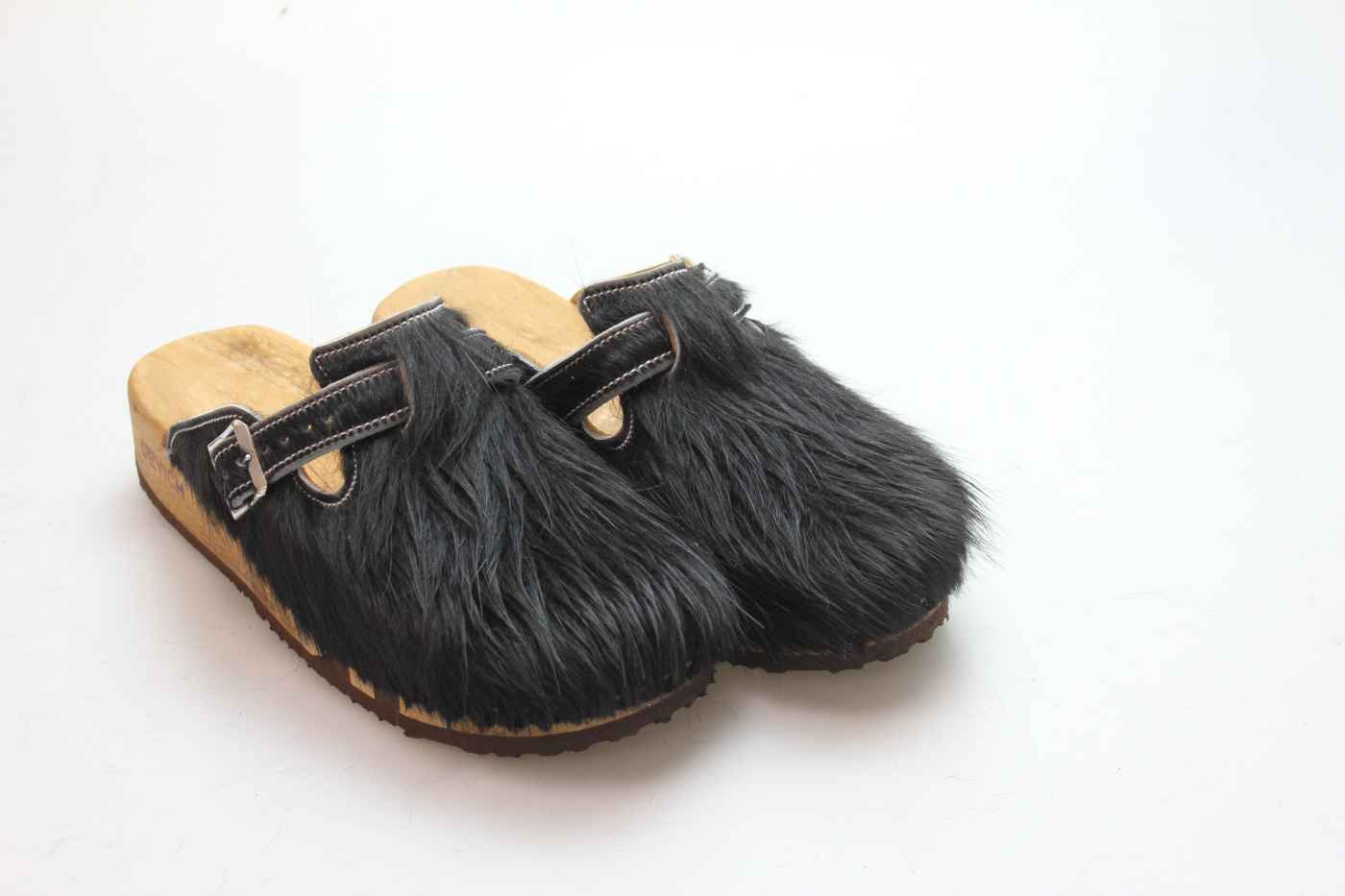 Das Obermaterial ist aus echtem Rindfell und in verschiedenen Farben erhältlich. Durch die Schnalle am Rist/Spann kann er dem Fuß angepasst werden. Im Bild sehen Sie das Exemplar, das Sie erhalten.