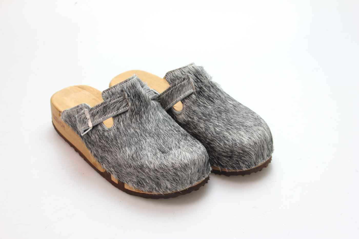 Das Obermaterial ist aus echtem Rindfell und in verschiedenen Farben erhältlich. Durch die Schnalle am Rist/Spann kann er dem Fuß angepasst werden. Im Bild sehen Sie das Exemplar, das Sie erhalten.