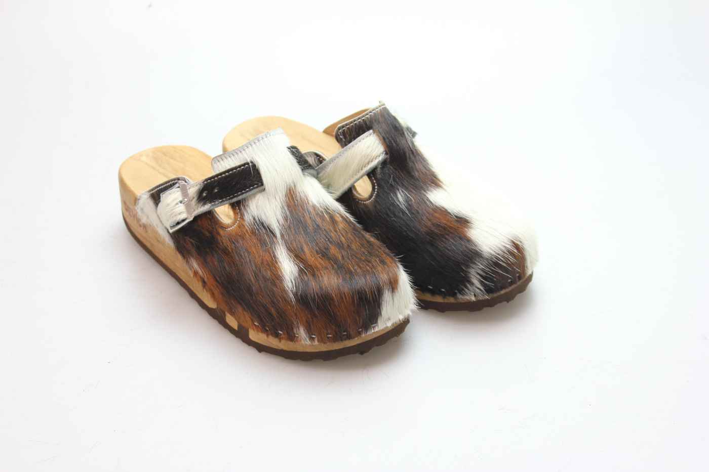 Das Obermaterial ist aus echtem Rindfell und in verschiedenen Farben erhältlich. Durch die Schnalle am Rist/Spann kann er dem Fuß angepasst werden. Im Bild sehen Sie das Exemplar, das Sie erhalten.