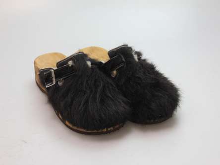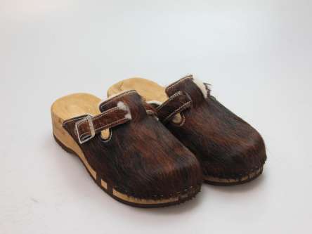 Die Holzsohle ist aus Pappelholz mit eingearbeitetem Fußbett und abriebfester Laufsohle. Das Oberleder ist aus echtem Rindfell. Durch die Schnalle am Rist/Spann kann er dem Fuß angepasst werden.
