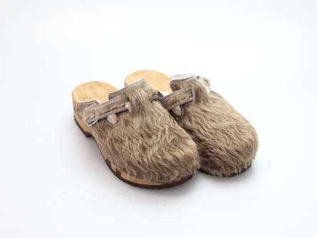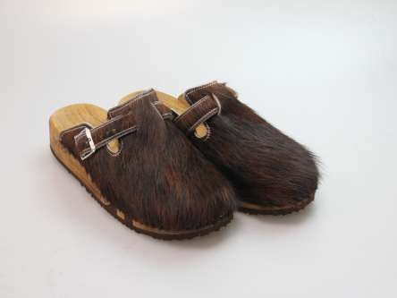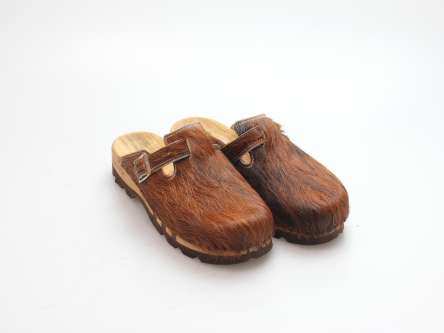Das Obermaterial ist aus echtem Rindfell und in verschiedenen Farben erhältlich. Durch die Schnalle am Rist/Spann kann er dem Fuß angepasst werden. Im Bild sehen Sie das Exemplar, das Sie erhalten.